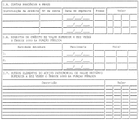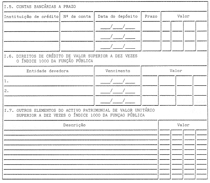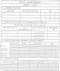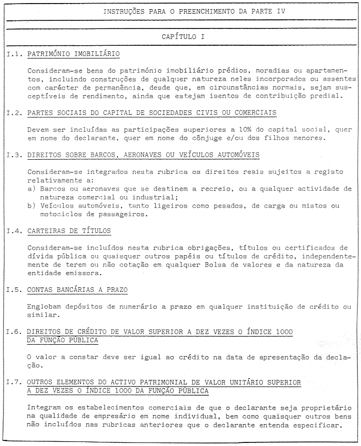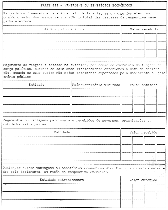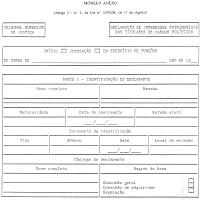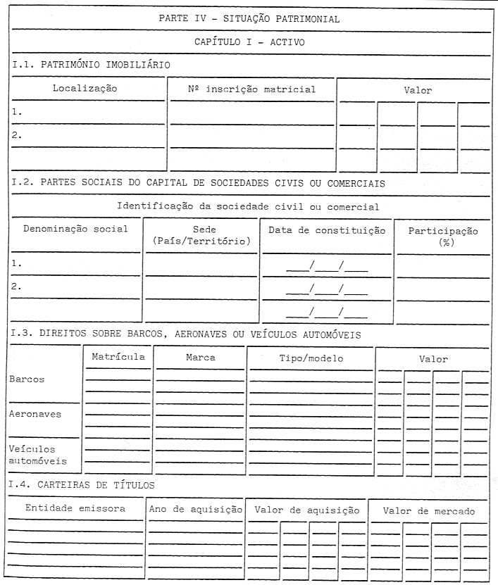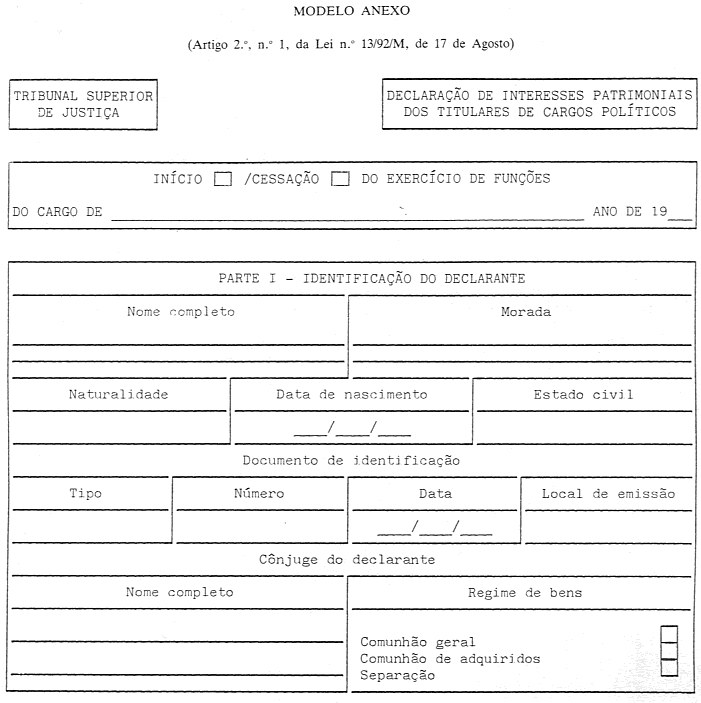 1. Os titulares dos cargos mencionados no artigo anterior estão obrigados à apresentação de uma declaração de interesses patrimoniais, constituída por quatro partes, mediante o preenchimento de impresso próprio, conforme modelo anexo à presente lei.