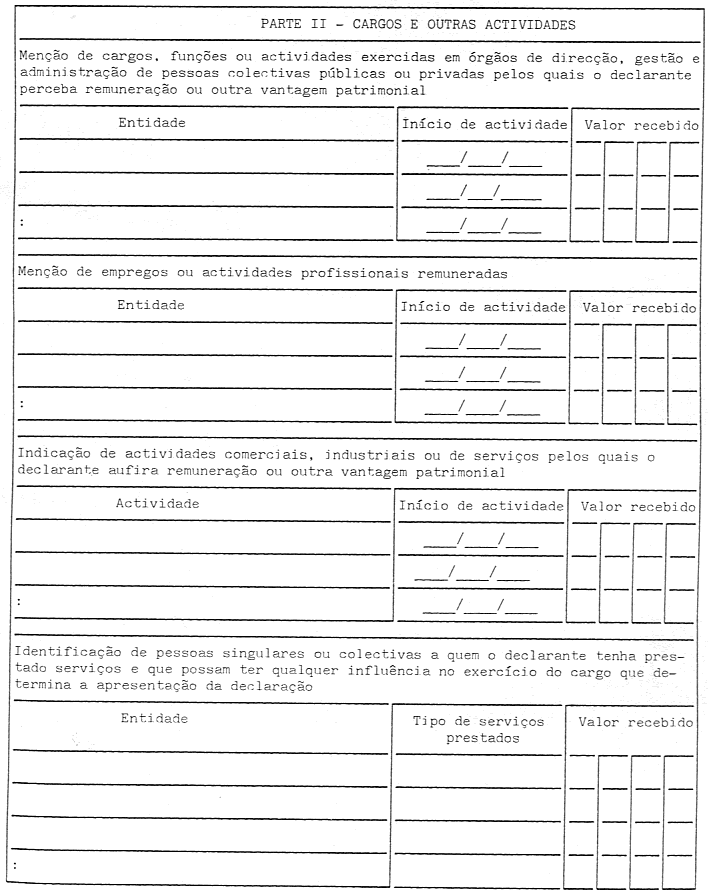 a) Menção de cargos, funções ou actividades exercidas em órgãos de direcção, gestão e administração de pessoas colectivas públicas ou privadas, pelos quais o declarante perceba remuneração ou outra vantagem patrimonial;
