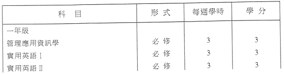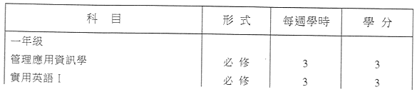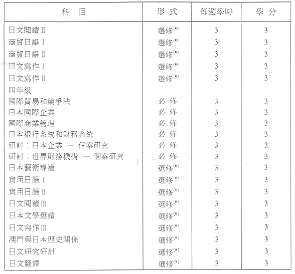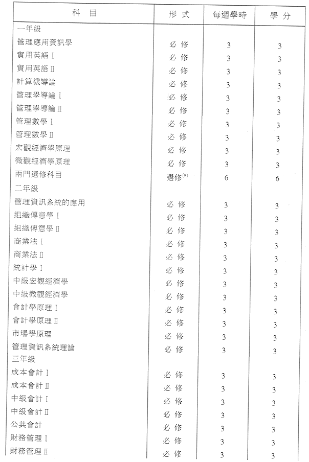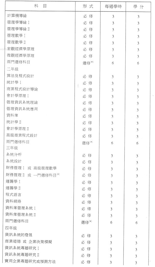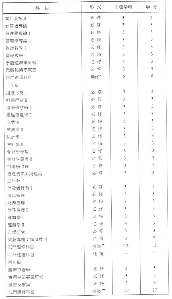 (*)選修科目由學生自工商管理學院院長指定的一套選修科目中選擇;一年級選修兩門,二年級選修四門,三年級和四年級各選修六門科目。