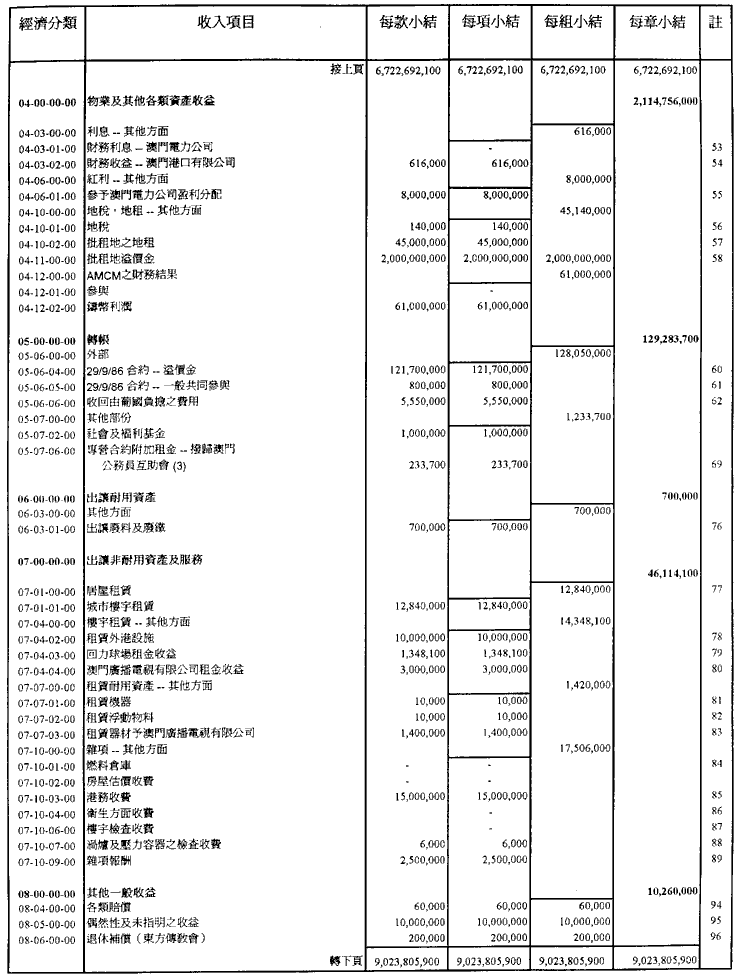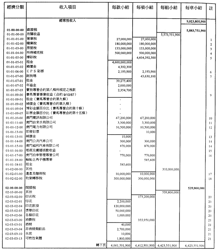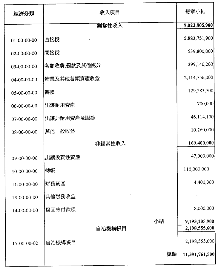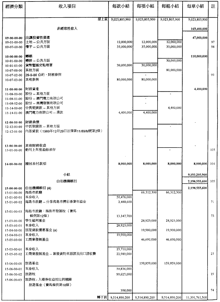 稅捐、直接與間接稅及其他收入之總所得估計為澳門幣9,193,205,900.00,並於一九九五年內按照現規範或將規範有關徵收之法律規定進行徵收;上述之總所得應根據現行法例,用於支付一九九五年內所作之開支。