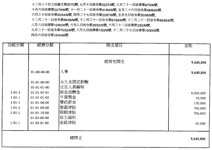 核准一九九五年經濟年度本地區總預算(OGT),並自一九九五年一月一日起執行;該預算係本法規之組成部分,並由財政司司長簽署。