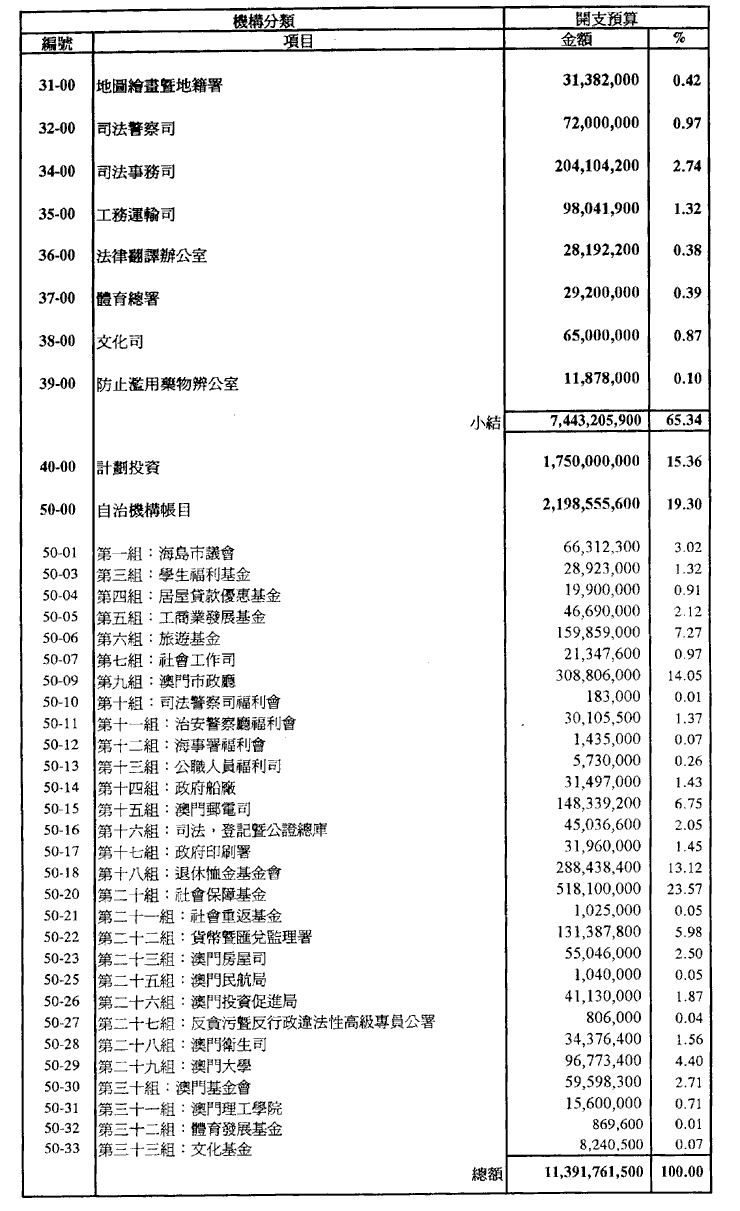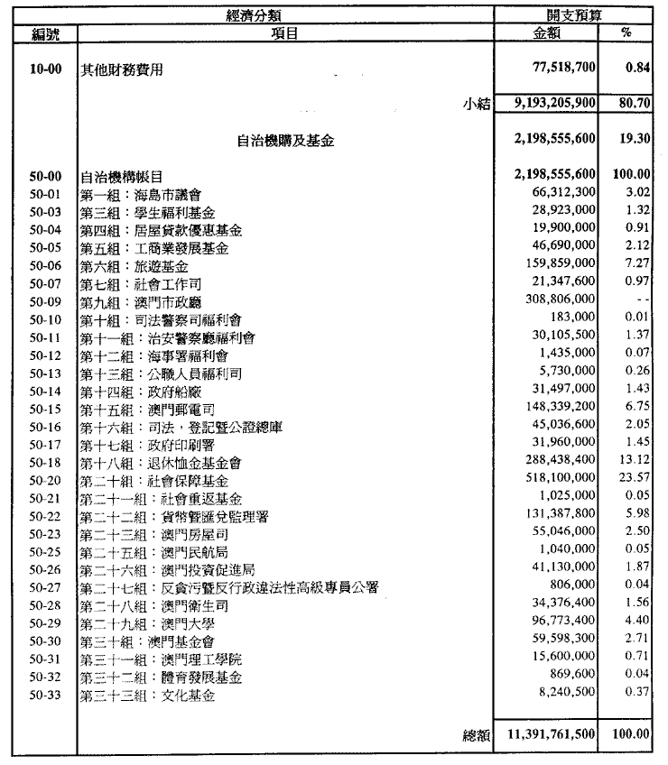 各自治實體及市政廳於一九九五年內徵收之本身收入及指定收入估計為澳門幣2,198,555,600.00,而該等收入按以下列明之數額,用於支付法律所許可且登錄於每一本身預算內之開支: