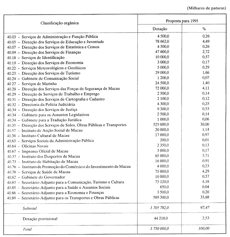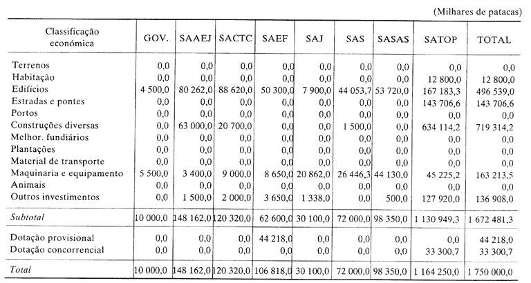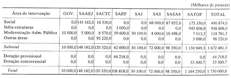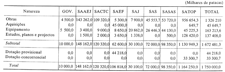 Do total das verbas orçamentadas no âmbito do PIDDA - 1995,44,2 milhões de patacas destinam-se à constituição de uma dotação provisional, 33,3 milhões visam cobrir concorrencialmente um conjunto de projectos da responsabilidade da Direcção dos Serviços de Solos, Obras Públicas e Transportes e os restantes 1 672,5 milhões estão ligados às 228 acções de investimento.