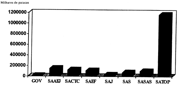 Repartindo a dotação global por áreas de responsabilidade, constata-se que os serviços na dependência do Secretário-Adjunto para os Transportes e Obras Públicas absorvem cerca de 64,6% dos projectos inscritos no PIDDA - 1994.