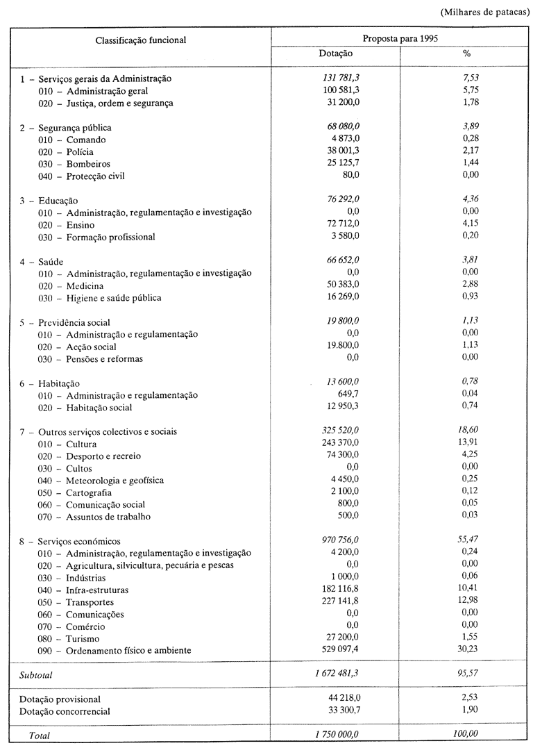 A proposta global do Plano de Investimentos e de Despesas de Desenvolvimento da Administração, para 1995, ascende a 1750,0 milhões de patacas, representando 19,7% do total das despesas previstas no orçamento geral do Território desse ano. Comparativamente com a situação inicial do exercício de 1994, verifica-se um decréscimo nominal de 3,8%.