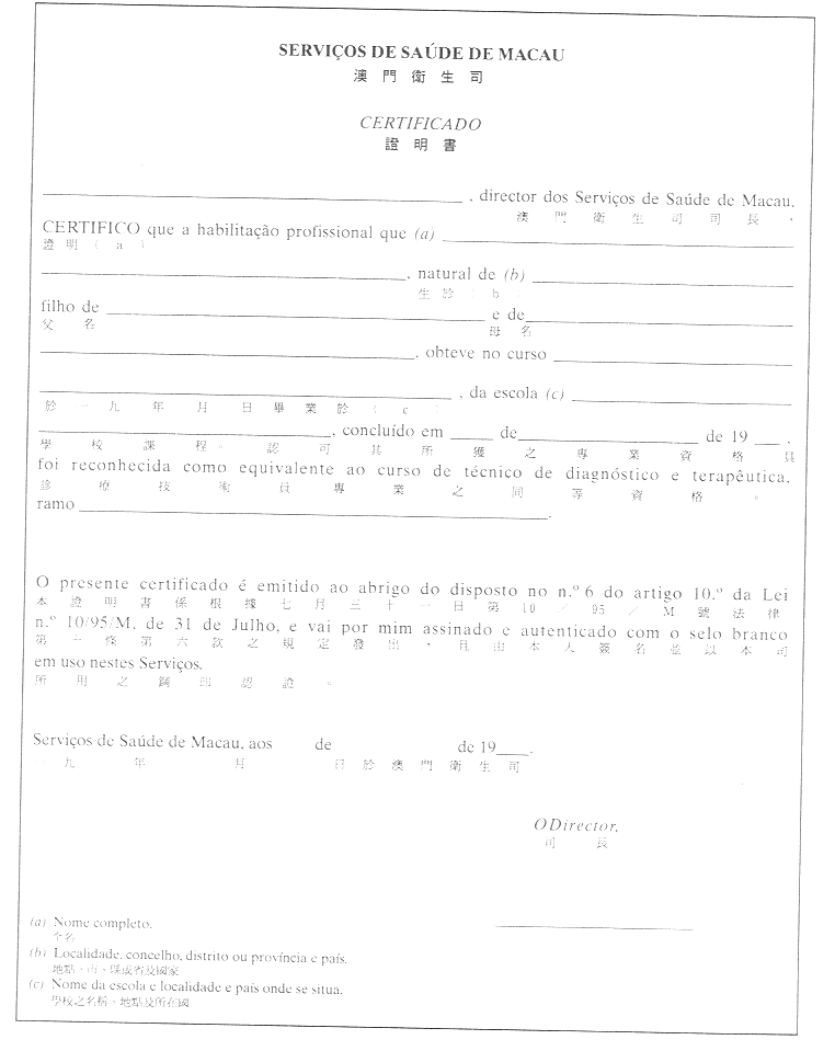 三、認可之申請應致澳門衛生司司長,并應附上課程學習計劃及計劃內各科考試或實習成績之證明文件。