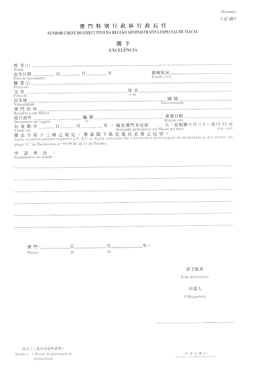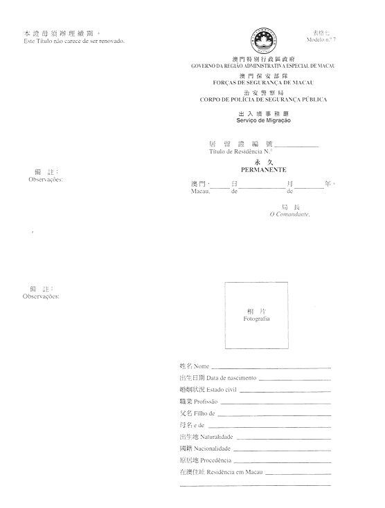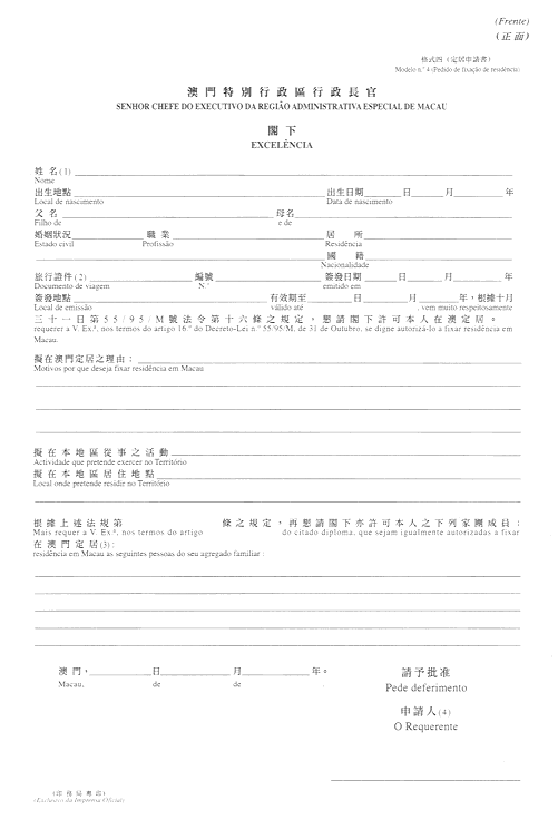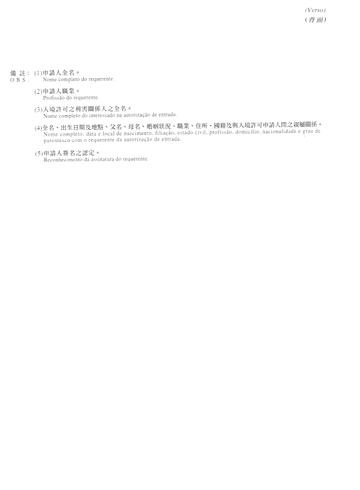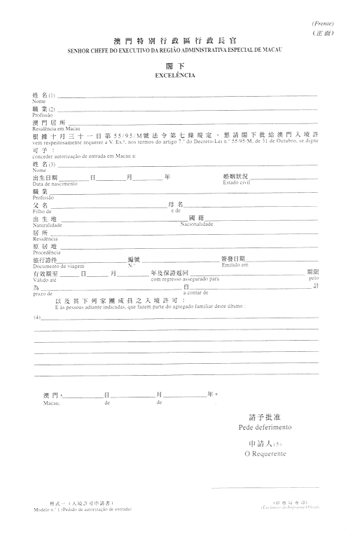 一、常居於無葡萄牙領事或外交代表處之國家或地區之人士之入境許可,應由利害關係人或法定代理人透過本法規所附格式一之文件,經治安警察廳(葡文縮寫為PSP)出入境事務局,向總督申請。