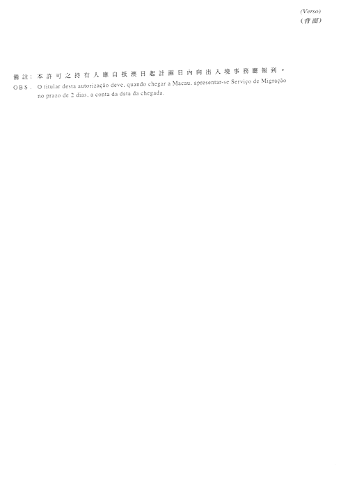 四、經國際機場進入澳門之過境乘客,得免除手續及費用,但須獲批給入境許可之情況除外;該入境許可係透過在護照上蓋上指明獲許可在本地區逗留期限之印章而為之。