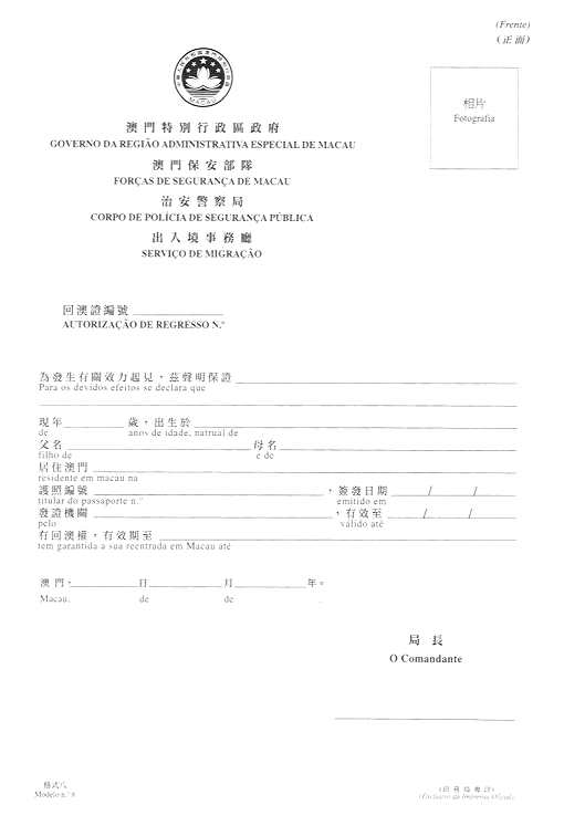 一、欲暫時離境前往其他國家或地區,而須向有關當局證實其獲准回澳之居留於澳門之人士,得透過本法規所附格式八之文件,向治安警察廳出入境事務局申請回境許可。