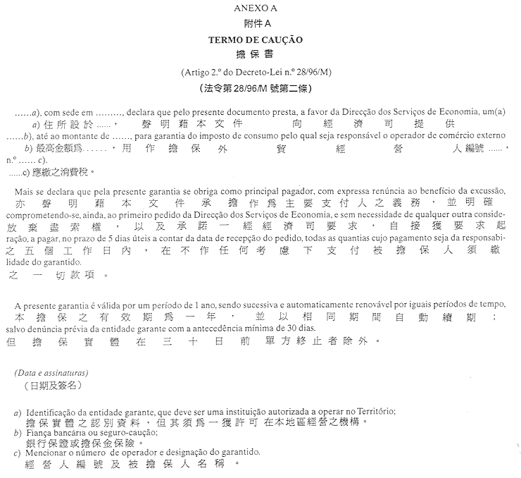 整體擔保制係指以附件A所指之整體擔保確保繳納因進口上條產品而須繳之消費稅。