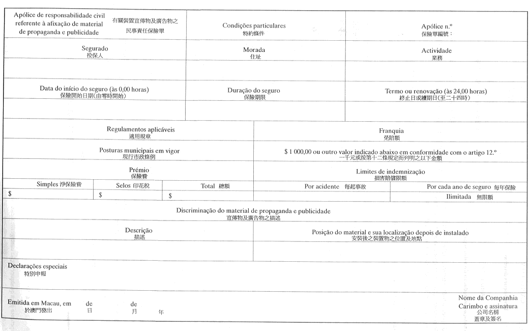 在澳門地區設立裝置宣傳物及廣告物之民事責任之保險,以及將此責任轉移予獲許可於本地區經營之保險人,促使核准該保險之統一保險單。
