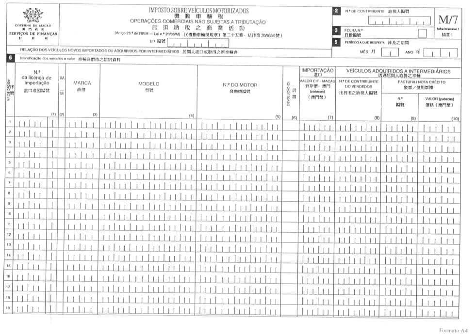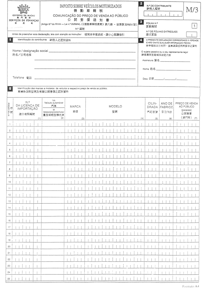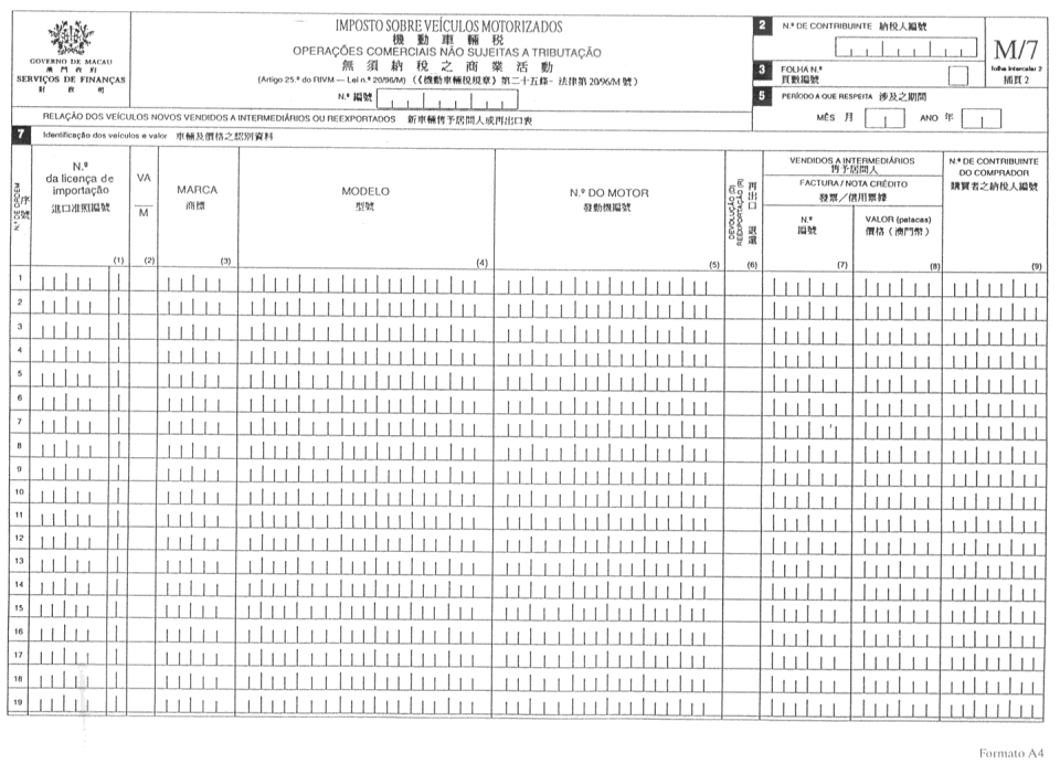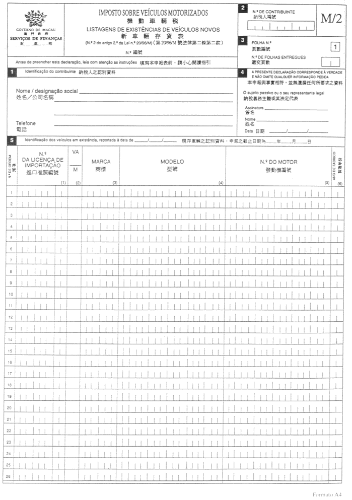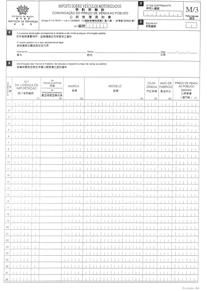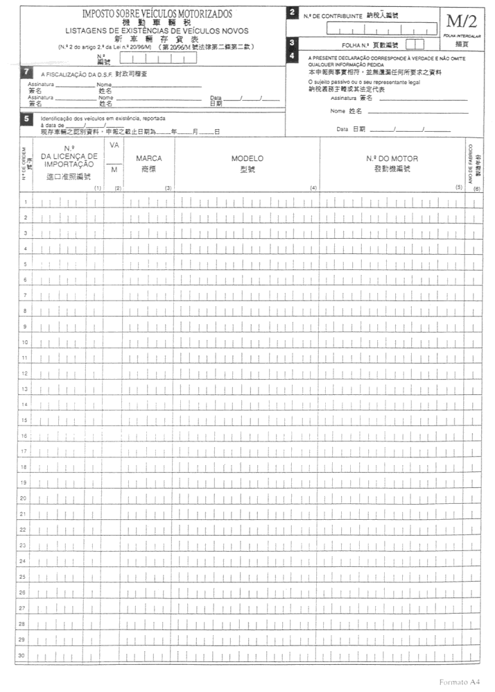 - .《機動車輛稅規章》第十四條第七款所指之載有更正或其他事項之申報表(亦需填寫M/4格式申報表——插頁2)。