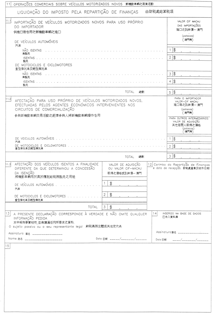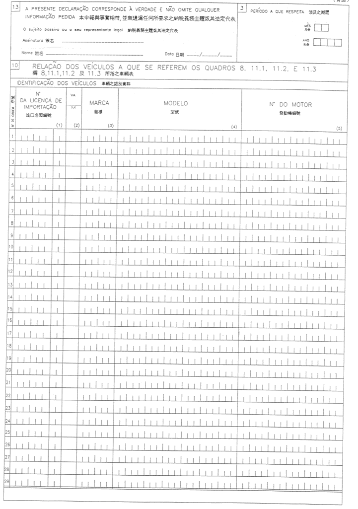 - .欄11.1——供進口商自用之機動車輛之進口,此乃《機動車輛稅規章》第一條第一款b項規定之情況。按照該規章第十四條第二款之規定,必須遞交申報表。