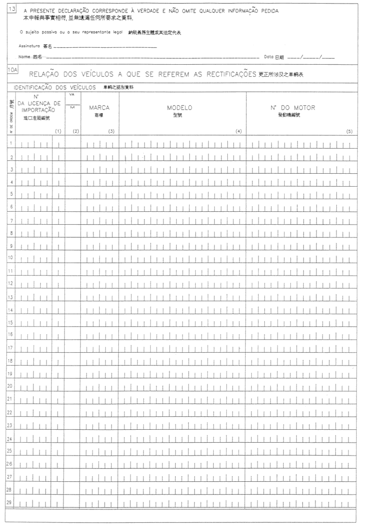 - .M——用作更改先前申報之車輛資料。按照欄10之指引,應在第二至第十四行列明車輛之正確資料。先前申報表登錄之資料將被是次申報所取代。第一行之內容(進口准照編號)不容更改;如本格有錯誤,納稅人應作出兩個更改行為:一為取消,另一為加插。