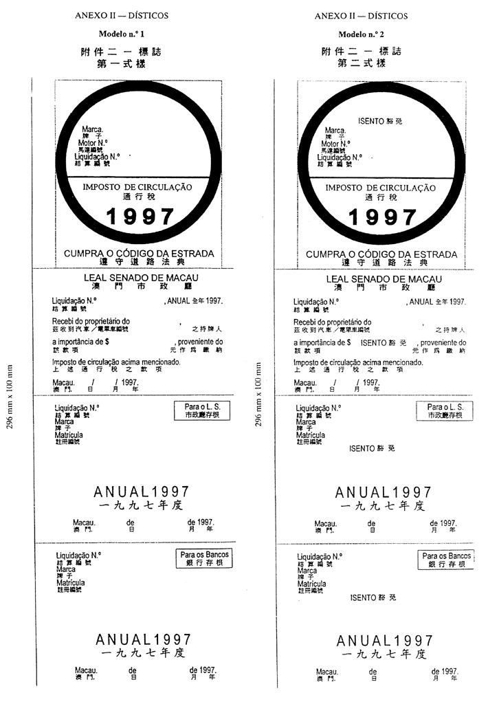 八月十二日第16/96/M號法律設立了車輛使用牌照稅及通過其有關規章,以便能夠於一九九七年一月一日開始生效。