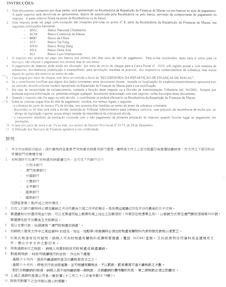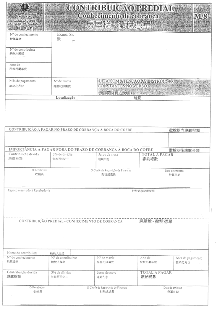 1. É alterado o impresso modelo M/8 do Regulamento da Contribuição Predial Urbana, aprovado pela Lei n.º 19/78/M, de 12 de Agosto, anexo ao presente despacho e que dele faz parte integrante.