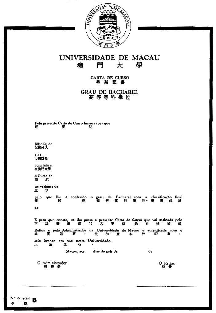 4.該證書由澳門大學校長及總務長聯署並以紅色/紫紅色色塊作底加蓋該大學的常用鋼印為憑。