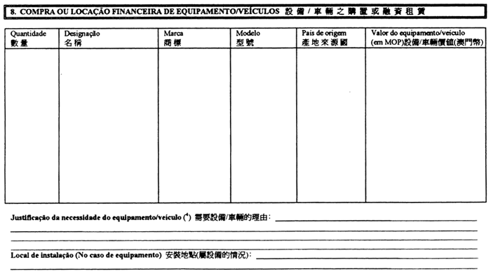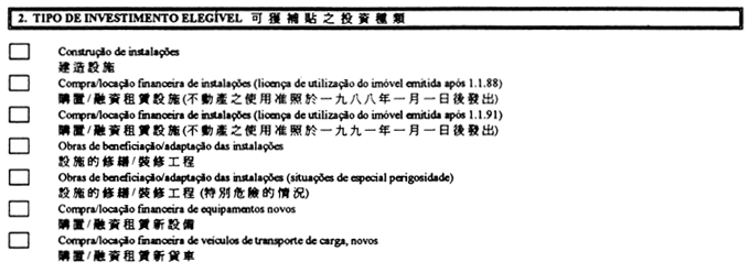 e)購置或融資租賃新貨車,只要該貨車已於本地區註冊且用於分銷屬經營澳門行業分類第一修訂版(葡文縮寫為CAM–Rev.1)B節──漁業或D節──加工業之企業本身之產品。