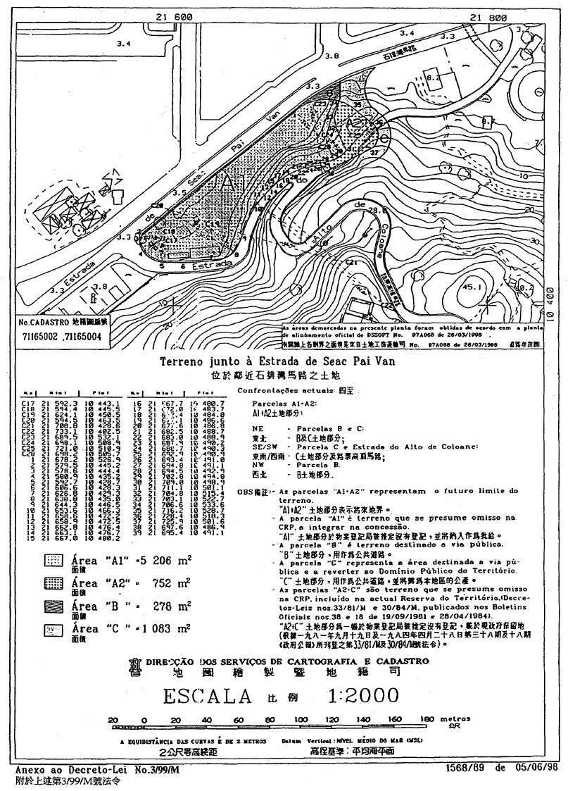 É levantada, ao abrigo do disposto no artigo 19.º da Lei n.º 6/80/M, de 5 de Julho, a reserva que incide sobre as parcelas de terreno com as áreas de 752 m2 e 1 083 m2, que se encontram assinaladas, respectivamente, pelas letras «A2» e «C» na planta n.º 1 568/89, emitida em 5 de Junho de 1998, pela Direcção dos Serviços de Cartografia e Cadastro, anexa a este diploma e do qual faz parte integrante.