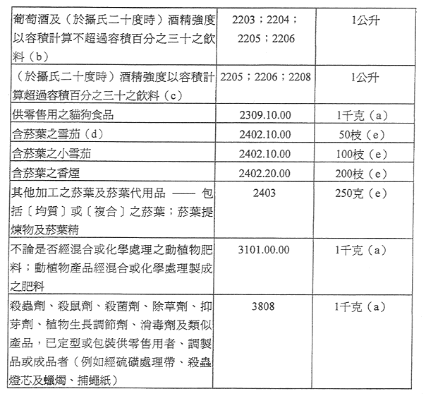 a)第四至二十一章、第二十三章、第三十一章及第三十八章列明之物品,每人攜帶總數之重量不得超過五千克。
