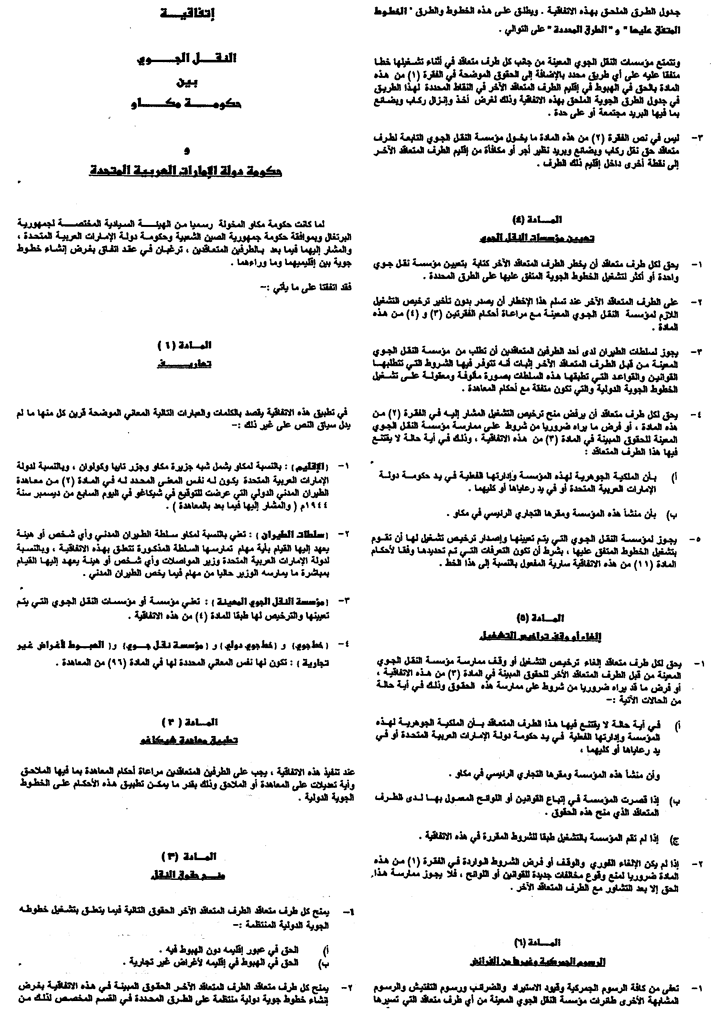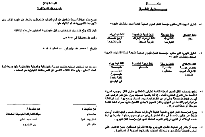 一九九八年十二月六日在杜拜簽訂的澳門政府與阿拉伯聯合酋長國政府航空運輸協定及有關附件。該協定及附件並由澳門總督於同日根據本人在一九九六年三月九日作出及刊登於同月九日《共和國公報》第二組副刊之批示核准。