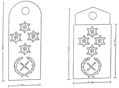 (1) Para superintendente-geral do Corpo de Polícia de Segurança Pública (CPSP) e da Polícia Marítima e Fiscal (PMF) — emblema com 2 pingalins cruzados dentro de uma coroa de louros e 4 estrelas de 6 pontas, com as siglas «CPSP» e «PMF», respectivamente, ao centro, aplicados sobre uma platina de cor vermelha, de acordo com a disposição e dimensões indicadas na figura 1 do anexo ao presente diploma e do qual faz parte integrante;