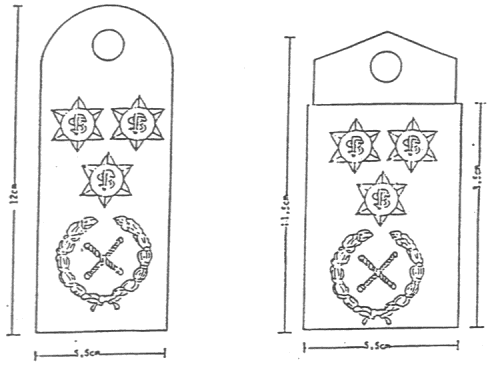 (3) Para superintendente do Corpo de Polícia de Segurança Pública (CPSP) e da Polícia Marítima e Fiscal (PMF) — emblema com 2 pingalins cruzados dentro de uma coroa de louros e 3 estrelas de 6 pontas, com as siglas «CPSP» e «PMF», respectivamente, ao centro, aplicados sobre uma platina de cor vermelha, de acordo com a disposição e dimensões indicadas na figura 2 do anexo ao presente diploma;