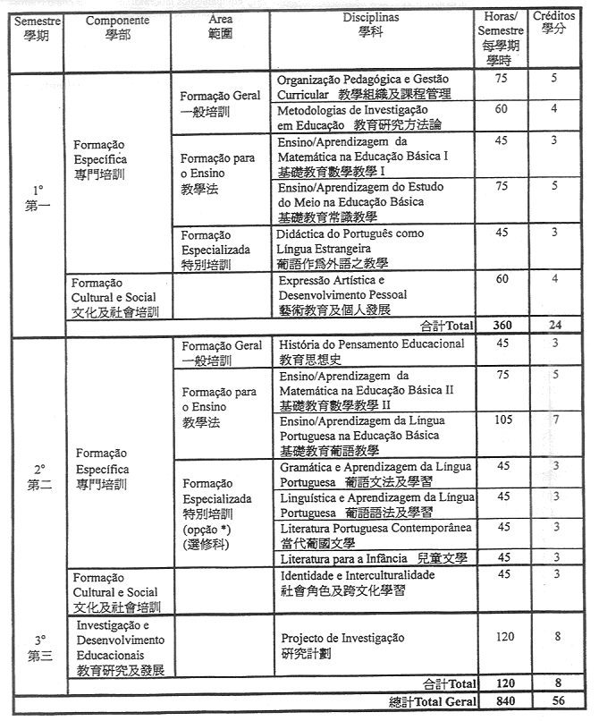 基礎教育第一階段(小學教育)教師葡語專業學術及教學補充培訓課程學習計劃