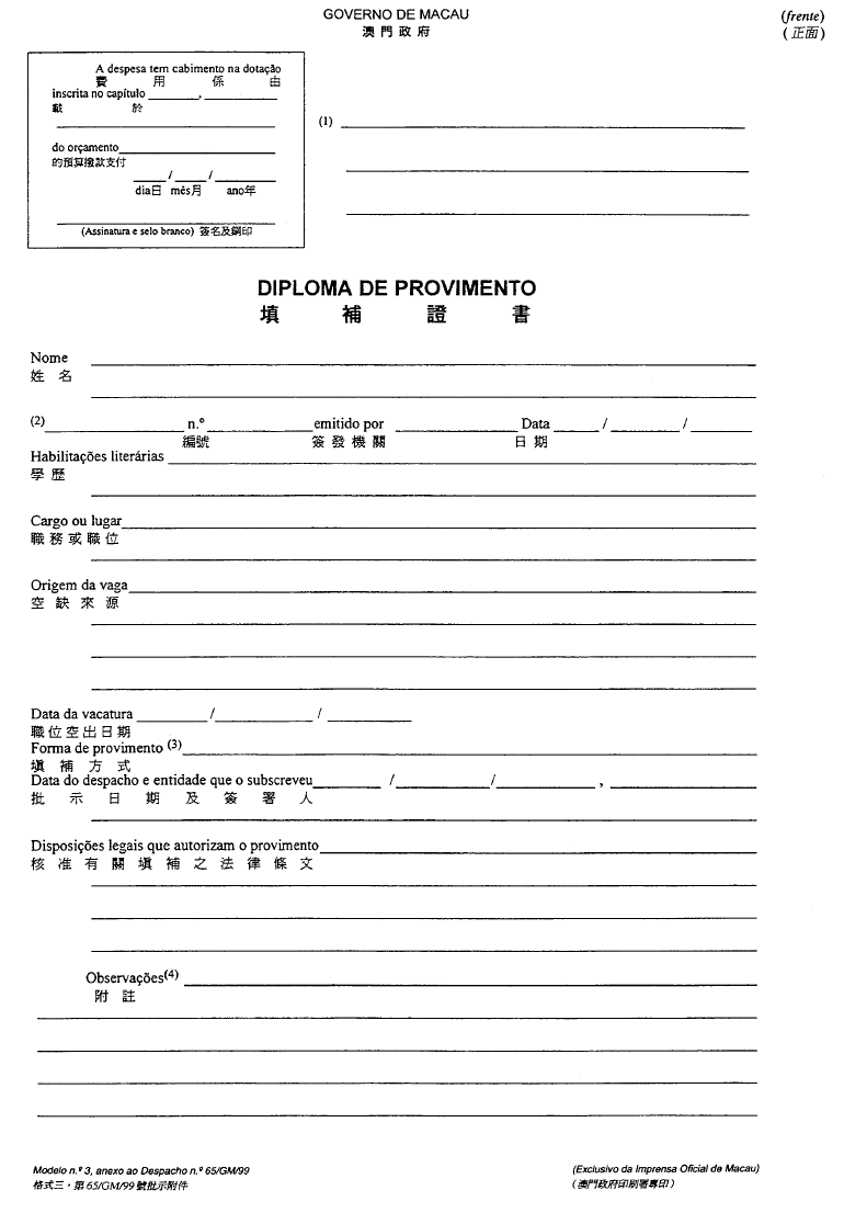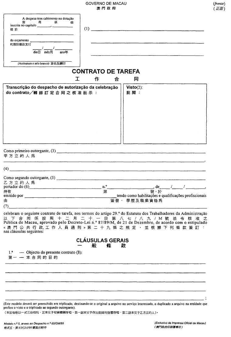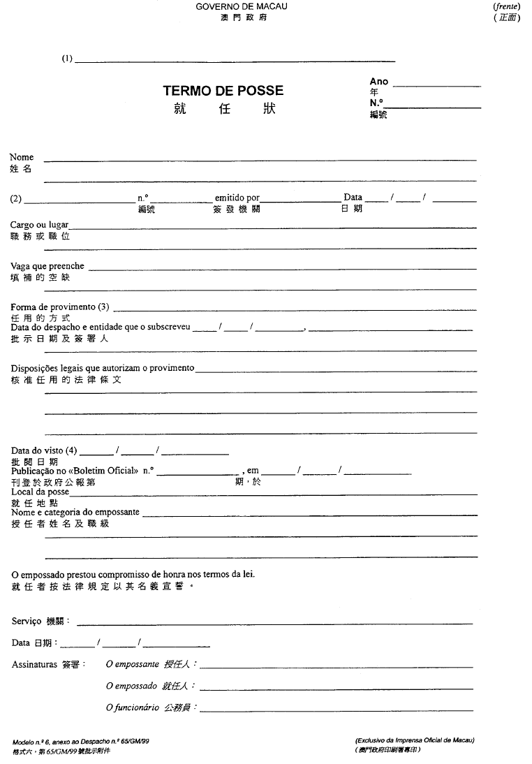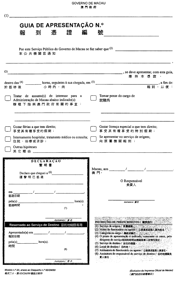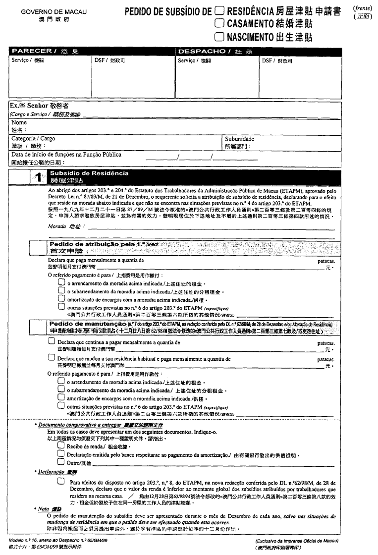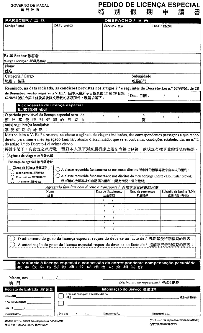 根據經十二月二十八日第62/98/M號法令修改的《澳門公共行政工作人員通則》,其中規定表格的式樣要由總督的批示批准;