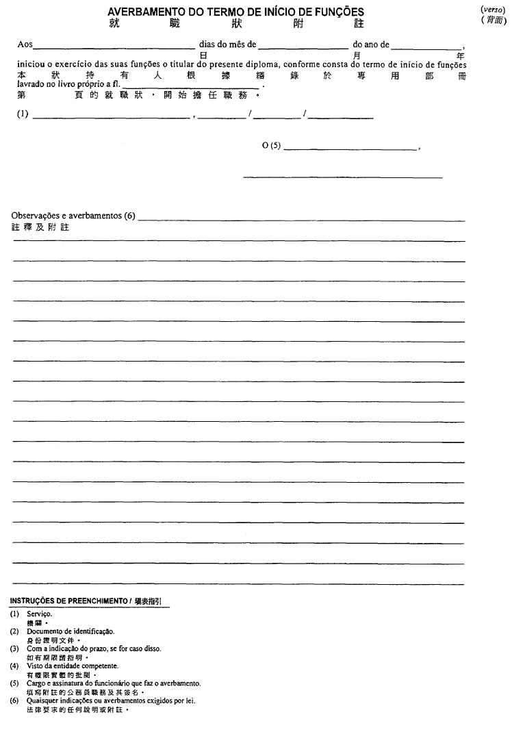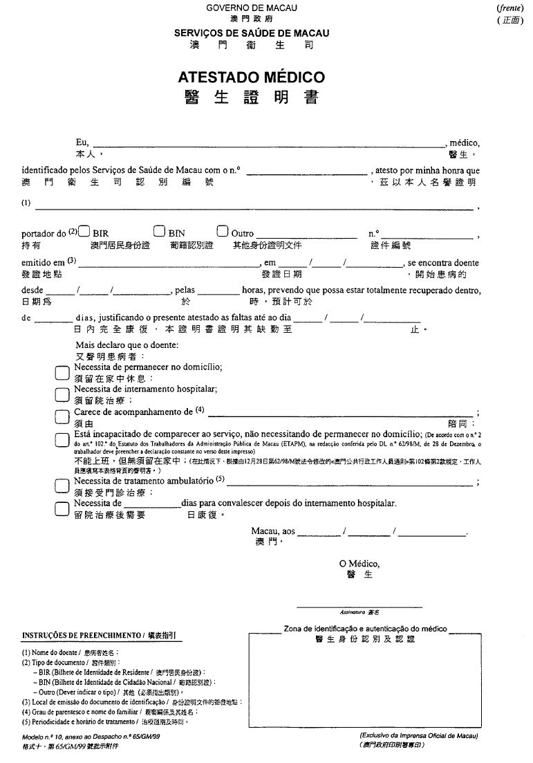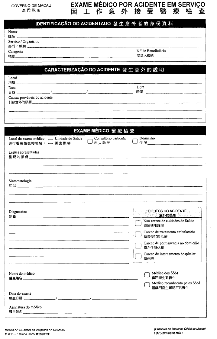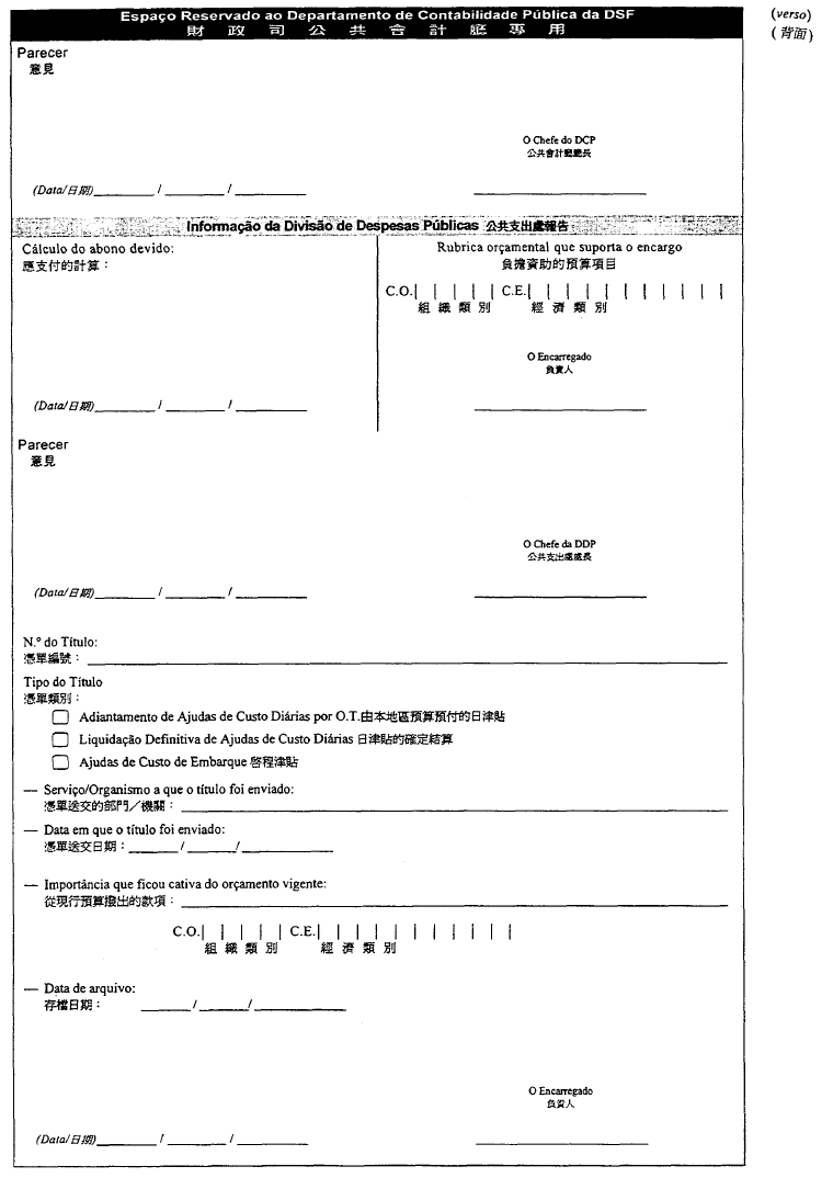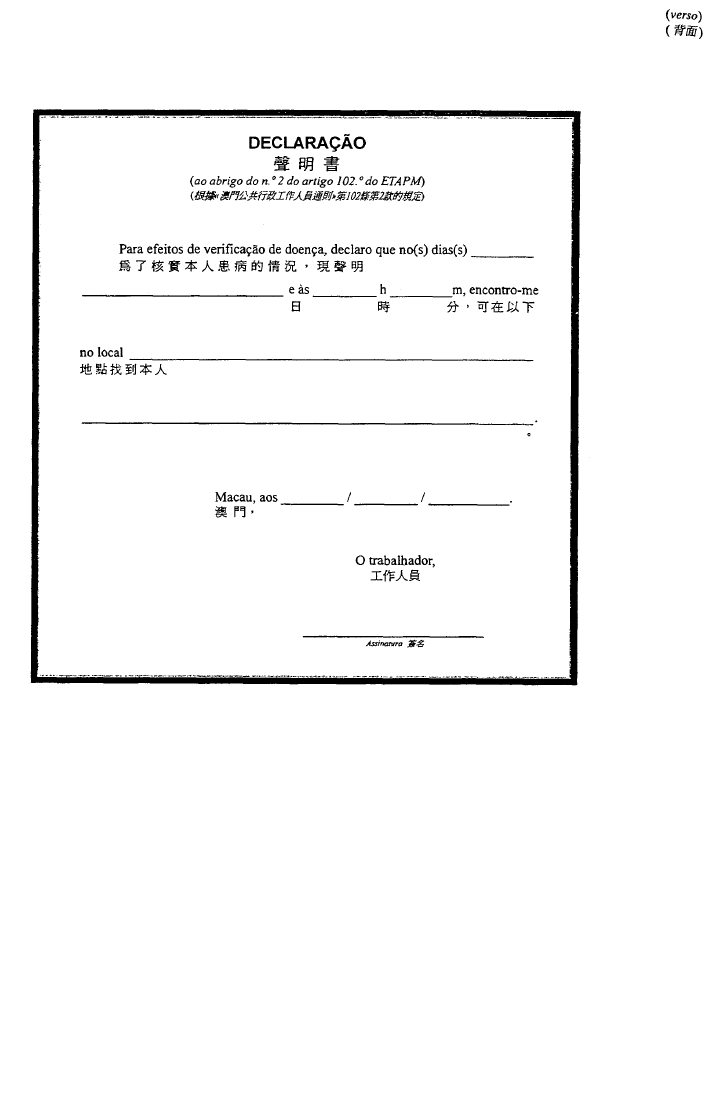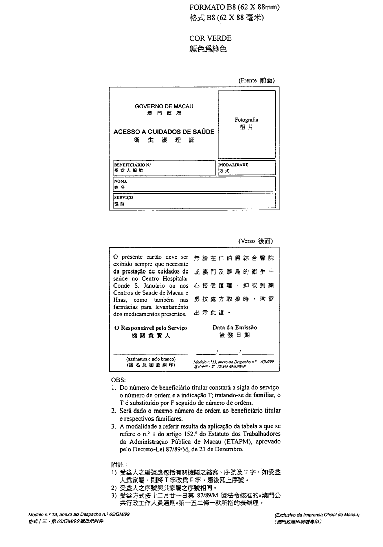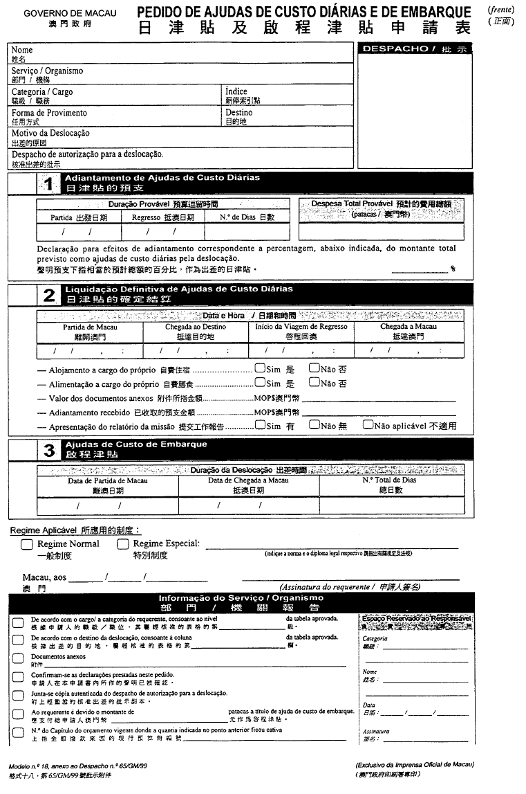 根據經十二月二十八日第62/98/M號法令修改的《澳門公共行政工作人員通則》,其中規定表格的式樣要由總督的批示批准;