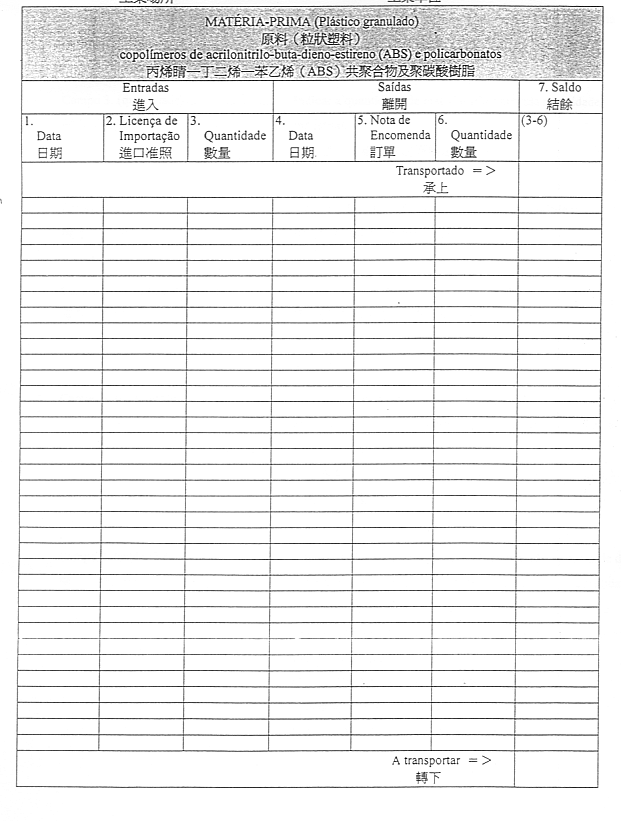 欄7(結餘=3-6) 指出以下兩數值相減而得出之數值:進入工業單位之原料之數量減去生產所需原料之數量。如屬日誌之有關部分之首頁,則第一行所指出之數值係相當於期初存貨。