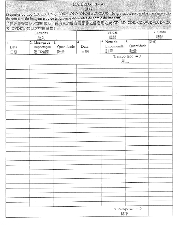 欄6(數量) 指出複製電腦程序、錄音製品或錄像製品之毋本或複製品所需原料之數量。