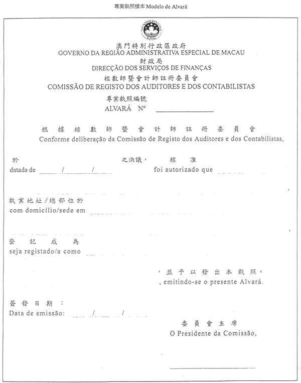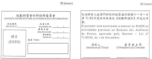 根據十一月一日第71/99/M號法令核准之《核數師通則》,給予核數師及從事該行業的公司執業准照,並向以個人名義從事該行業的人士發給專業證。