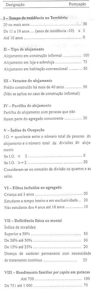 2. É aprovado o mapa de pontuação a atribuir às características a inquirir para definição das condições socioeconómicas e habitacionais dos agregados familiares concorrentes, previsto no artigo 12.º do Decreto-Lei n.º 69/88/M, de 8 de Agosto, na nova redacção dada pelo Decreto-Lei n.º 30/96/M, de 11 de Junho, constante do Anexo 2 à presente portaria e da qual faz parte integrante.