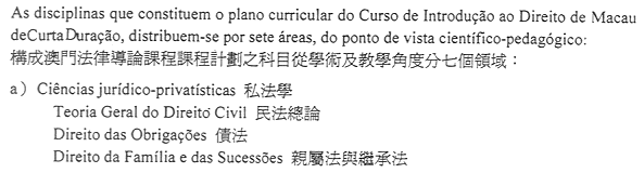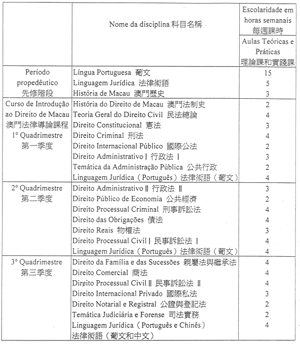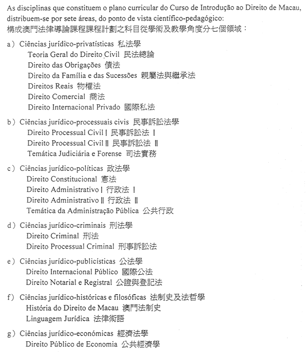 第二條——澳門法律導論課程為期不少於三個季度,包括配合特定條件和要求的基本法律科目的學習。須經過先修階段,成績合格者方可進入基本法律科目之學習。各科成績合格者獲頒發證書。