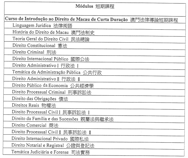 經適當調整之澳門法律導論短期課程具有相同目標,旨在使從與澳門法律制度同源並有密切聯繫之國家獲得法學士學位者熟悉澳門法律。