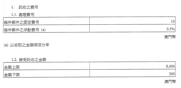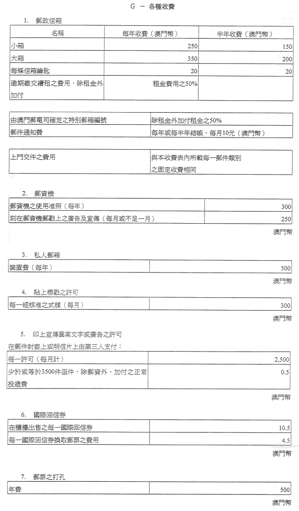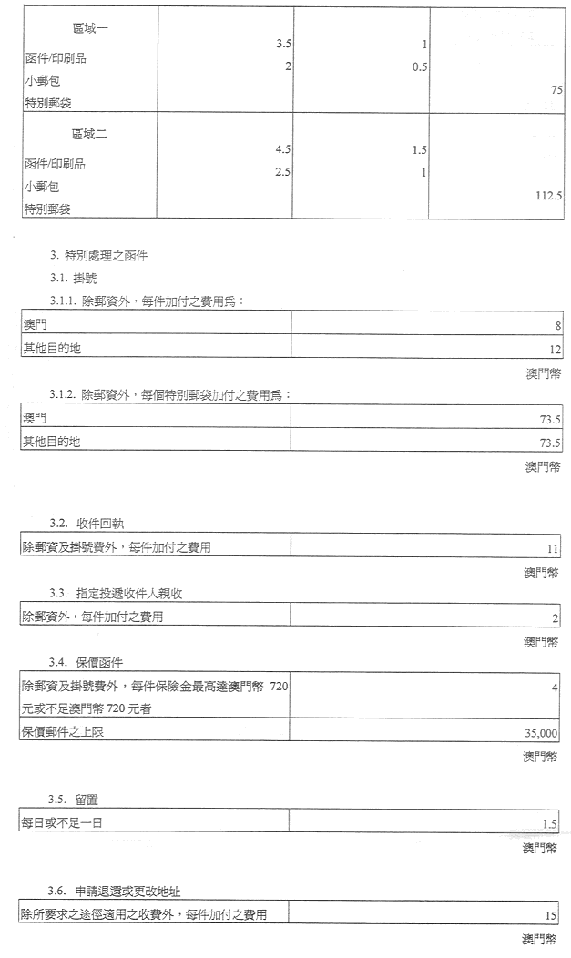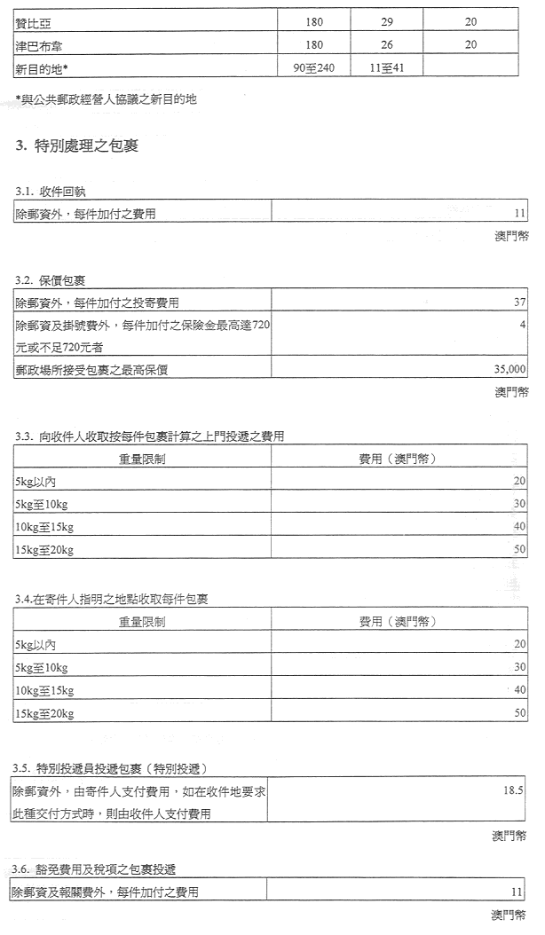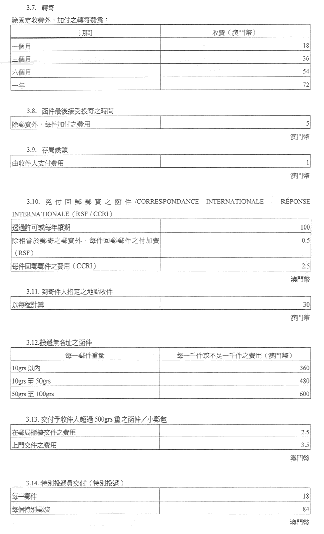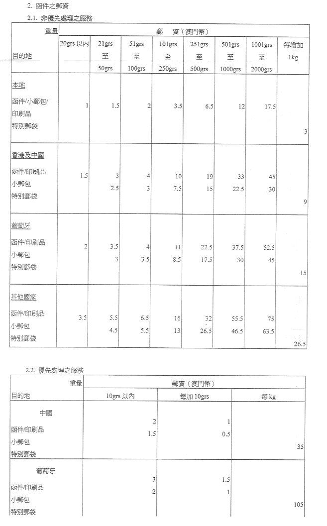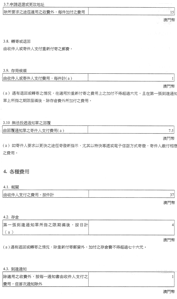 現核准之表訂定郵政服務之收費及罰款,有關金額之調整係考慮到經濟實況及與提供該種服務有關之成本而作出,且有關成本係受到固有之國際聯繫制約。