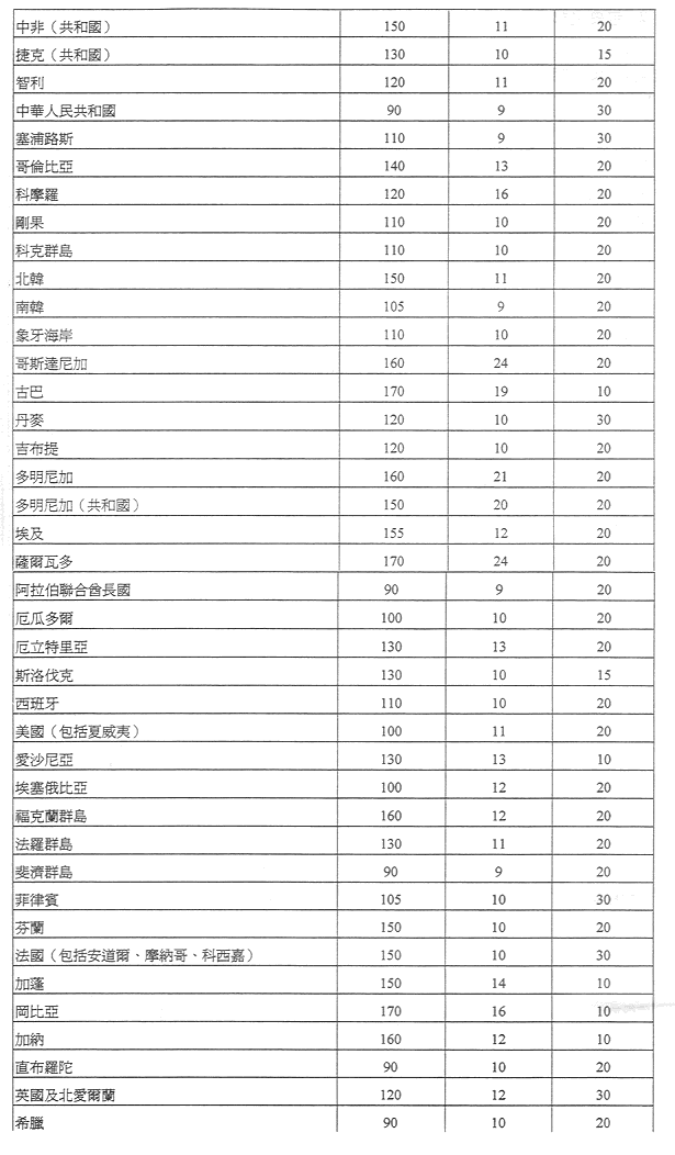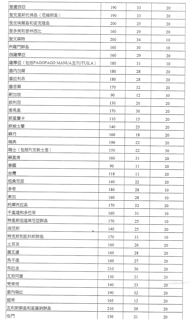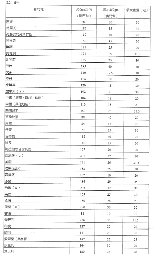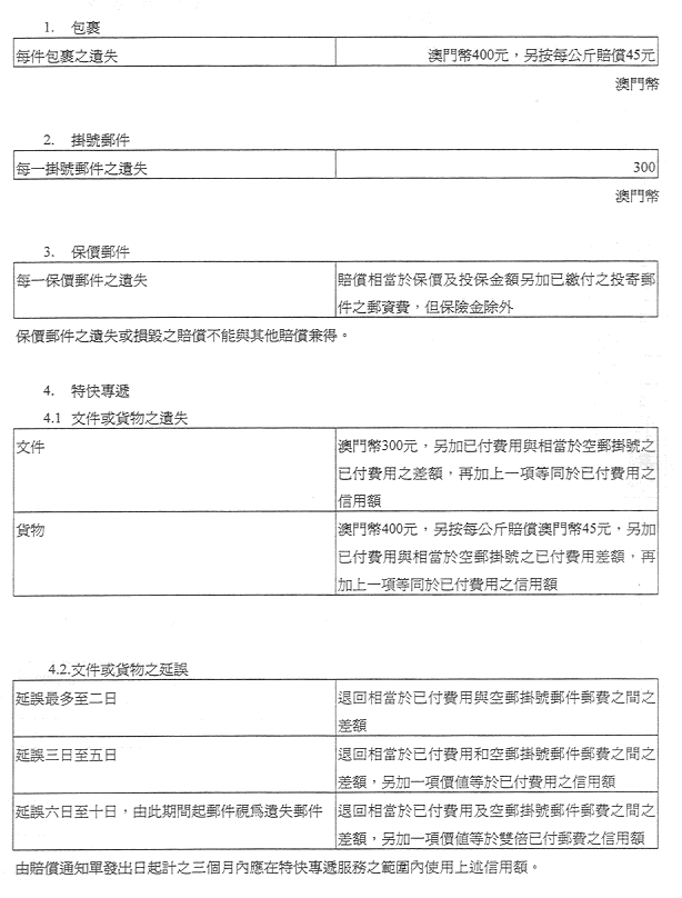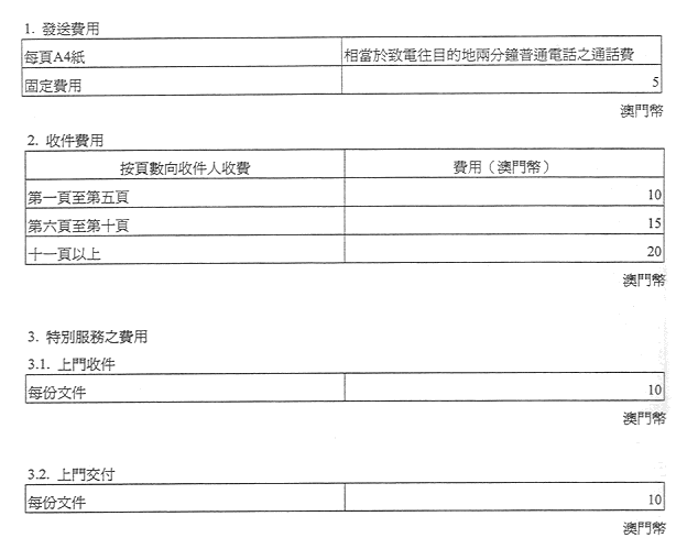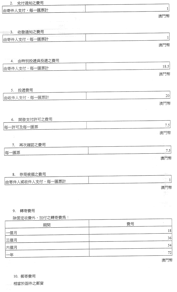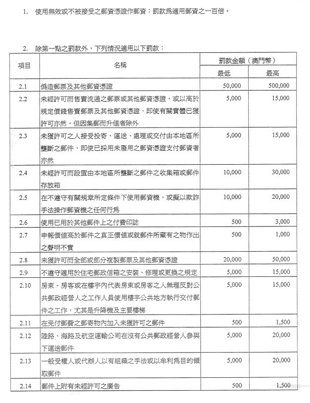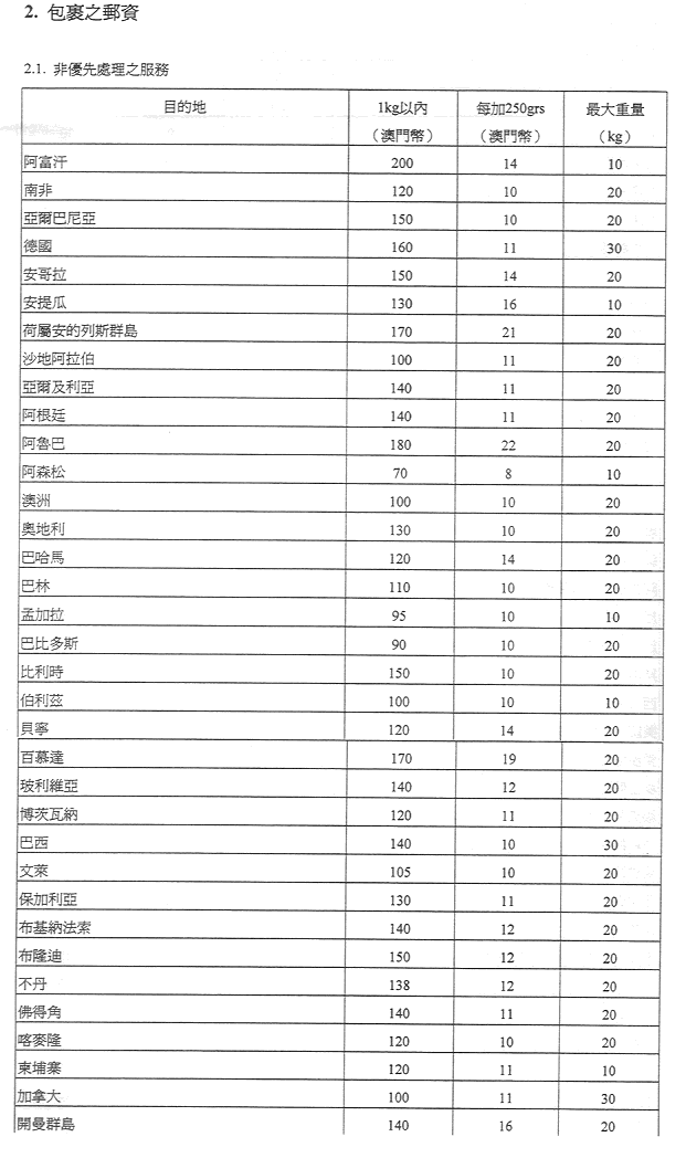 現核准之表訂定郵政服務之收費及罰款,有關金額之調整係考慮到經濟實況及與提供該種服務有關之成本而作出,且有關成本係受到固有之國際聯繫制約。