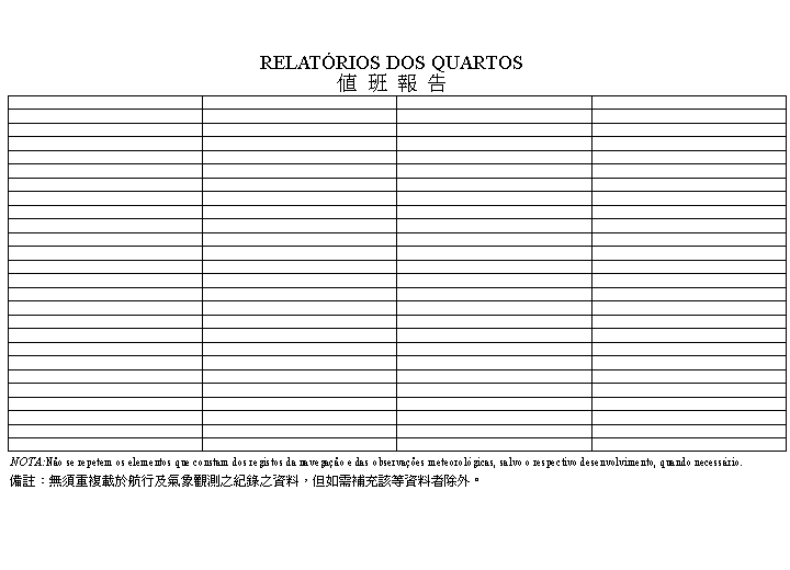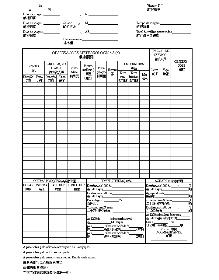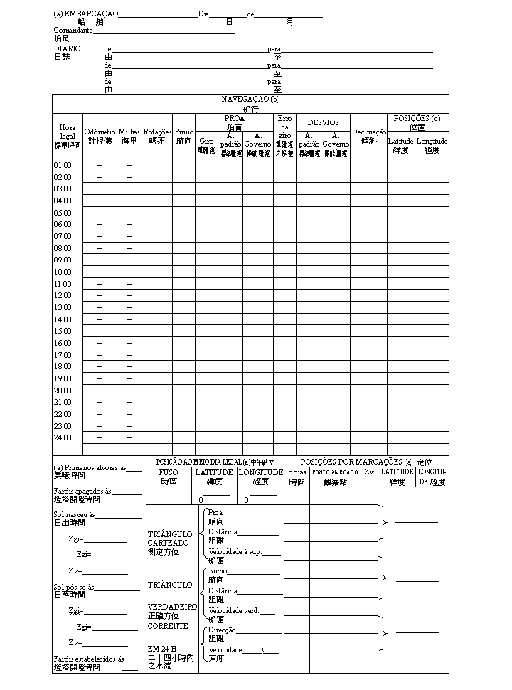 根據十一月二十九日第90/99/M號法令核准之《海事活動規章》第六十九條第四款之規定,航海日誌之式樣須以訓令核准,航海日誌係一必須將所有與航行有關之資料及事實記錄在內之航行記錄簿。