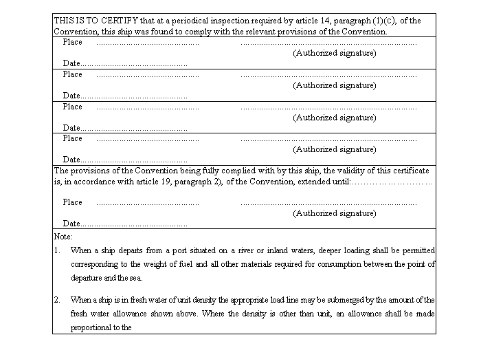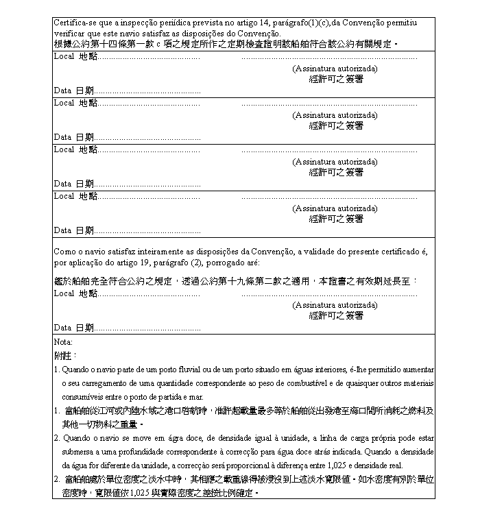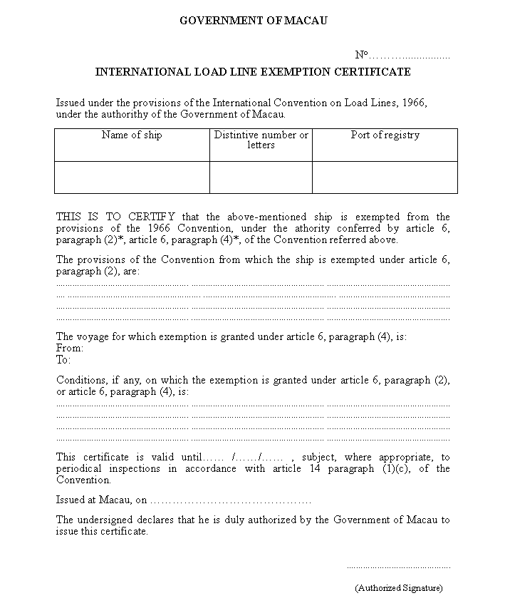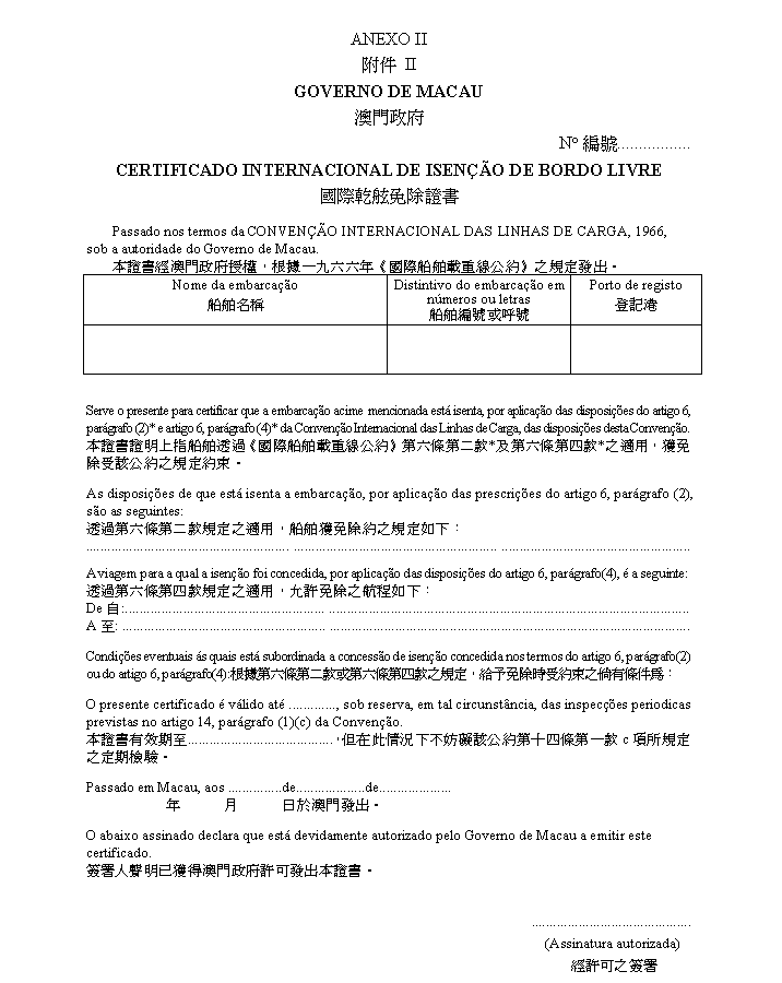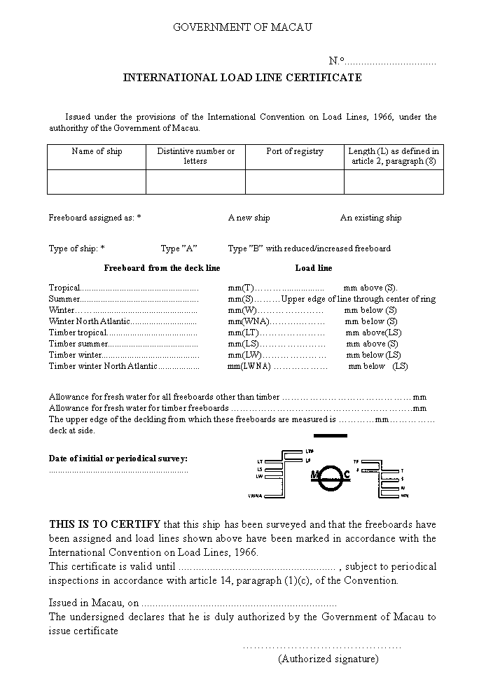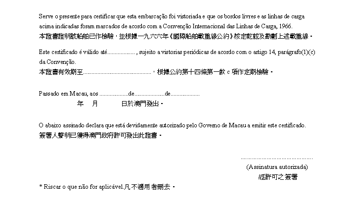 根據十一月二十九日第90/99/M號法令核准之《海事活動規章》第六十四條第四款之規定,國際載重線證書及國際乾舷免除證書之式樣及發出條件由訓令核准。