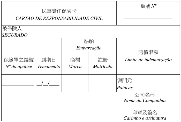 一、被列為遊艇之船舶(葡文縮寫為ER),須向獲許可之保險人投購在使用該船時對第三人引致損害之民事責任保險後,方得航行。