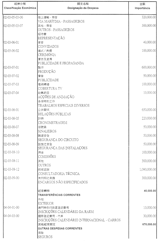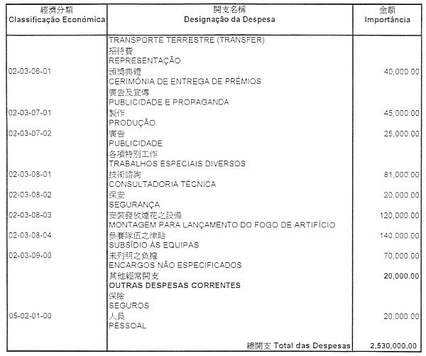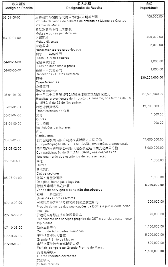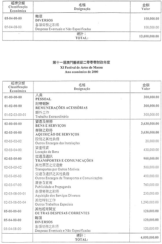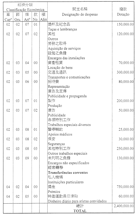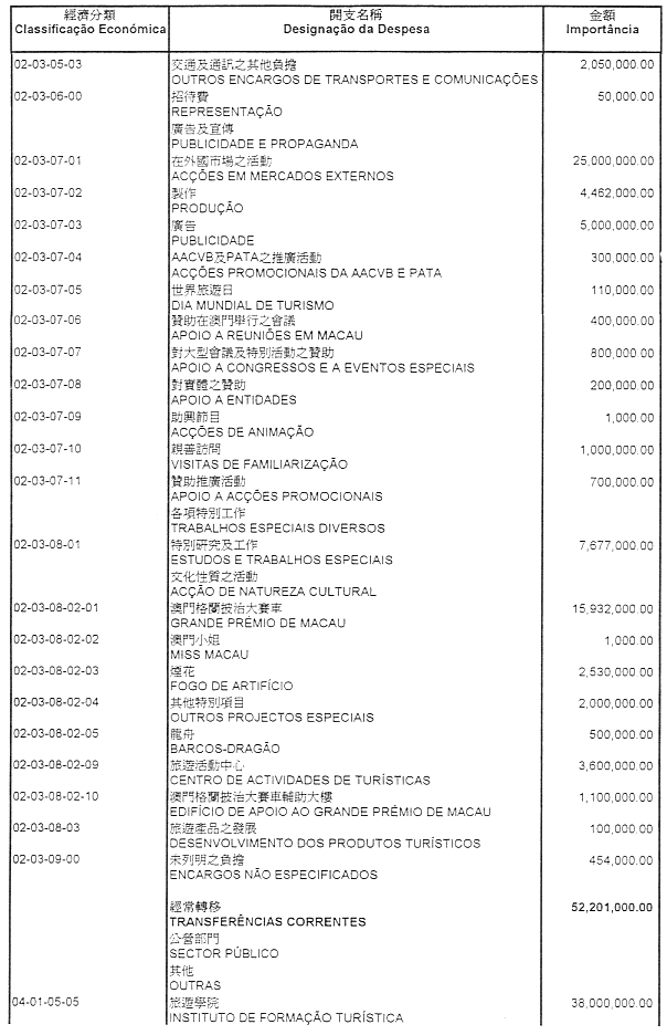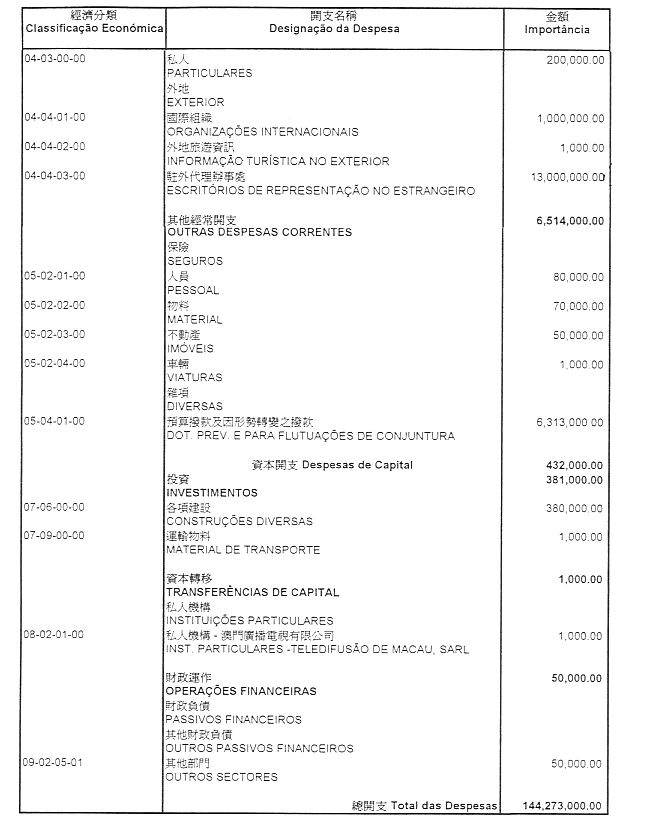 核准澳門旅遊基金二零零零年財政年度之本身預算,並於二零零零年一月一日起開始執行,預計收入及開支之金額均為澳門幣144,273,000.00(壹億肆仟肆佰貳拾柒萬叁仟元正),該預算為本批示之組成部分。