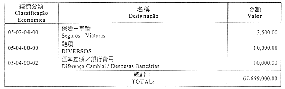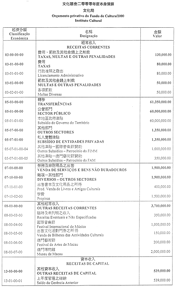 核准文化基金二零零零年財政年度之本身預算,並於二零零零年一月一日起開始執行,預計收入及開支之金額均為澳門幣67,669,000.00(陸仟柒佰陸拾陸萬玖仟元整),該預算為本批示之組成部分。