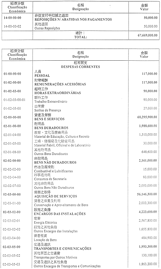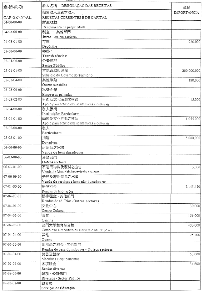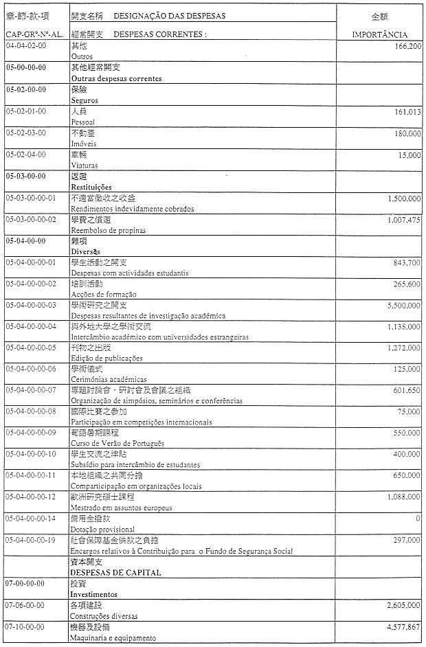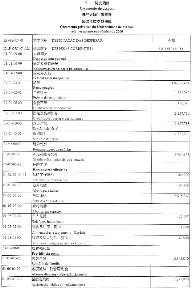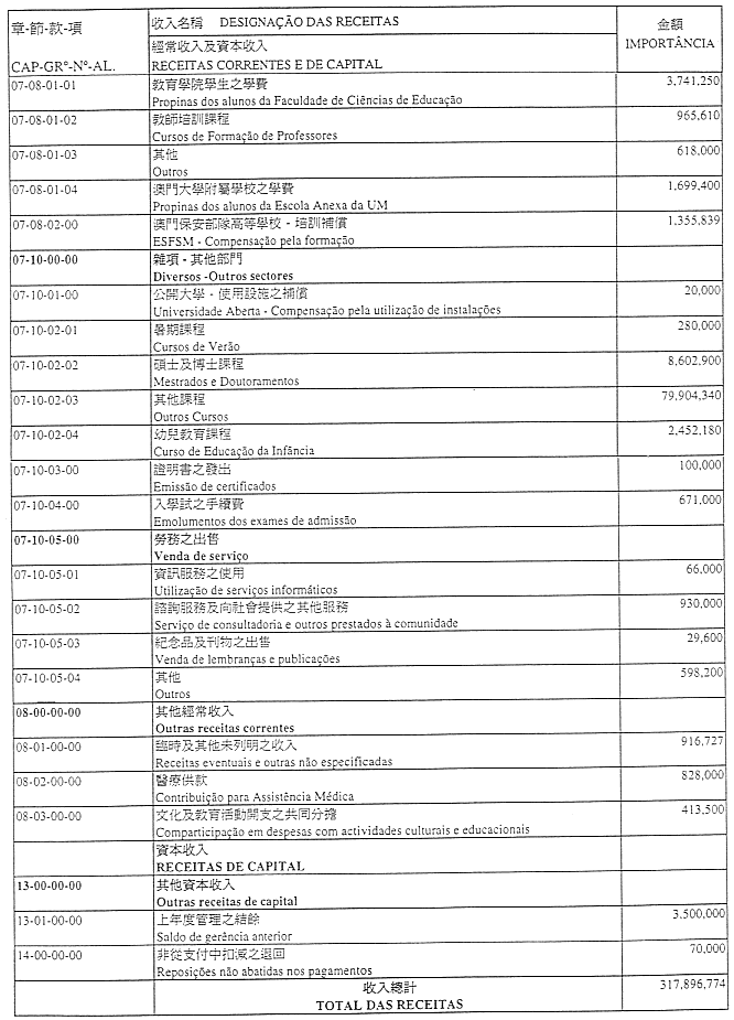核准澳門大學二零零零年財政年度之本身預算,並於二零零零年一月一日起開始執行,預計收入及開支之金額均為澳門幣317,896,774.00 (叁億壹仟柒佰捌拾玖萬陸仟柒佰柒拾肆元整),該預算為本批示之組成部分。