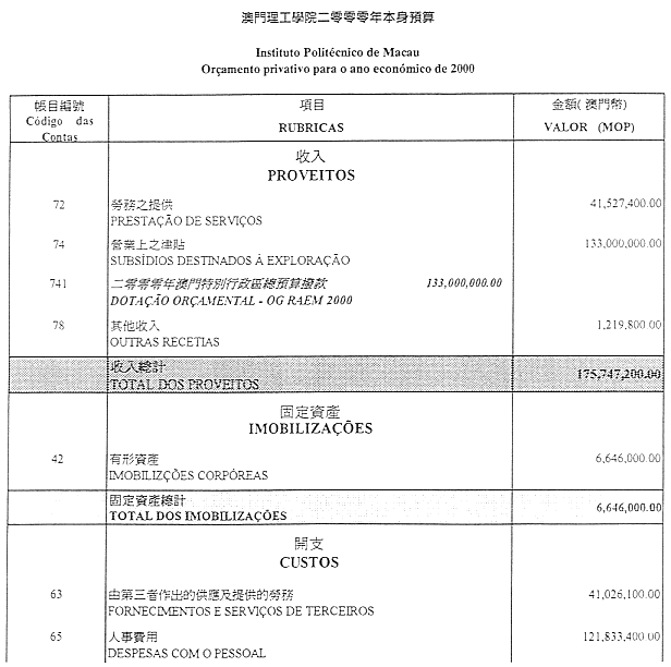 核准澳門理工學院二零零零年財政年度之本身預算,並於二零零零年一月一日起開始執行,預計收入及開支之金額均為澳門幣175,747,200.00(壹億柒仟伍佰柒拾肆萬柒仟貳佰元整),該預算為本批示之組成部分。