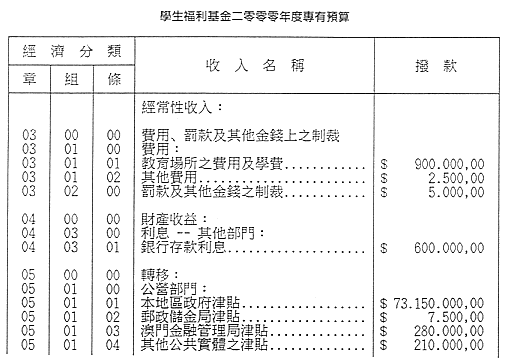 核准學生福利基金二零零零年財政年度之本身預算,並於二零零零年一月一日起開始執行,預計收入及開支之金額均為澳門幣107,270,000.00(壹億零柒佰貳拾柒萬元整),該預算為本批示之組成部份。