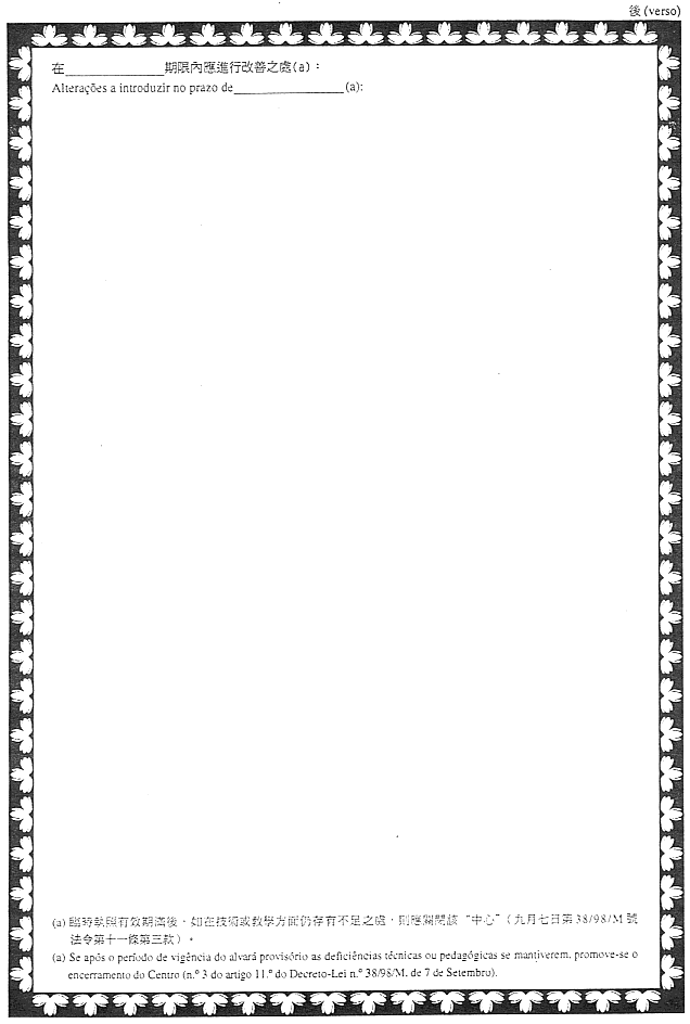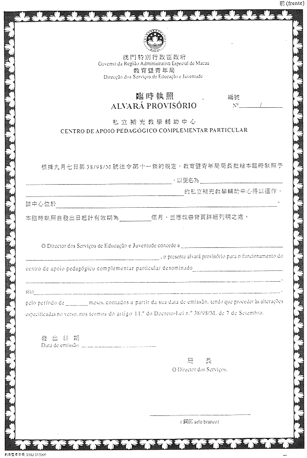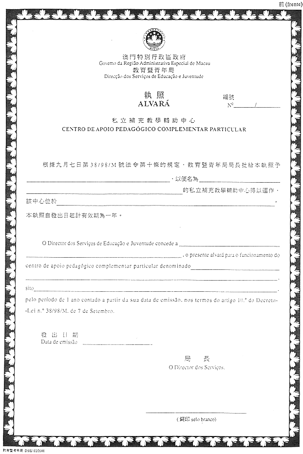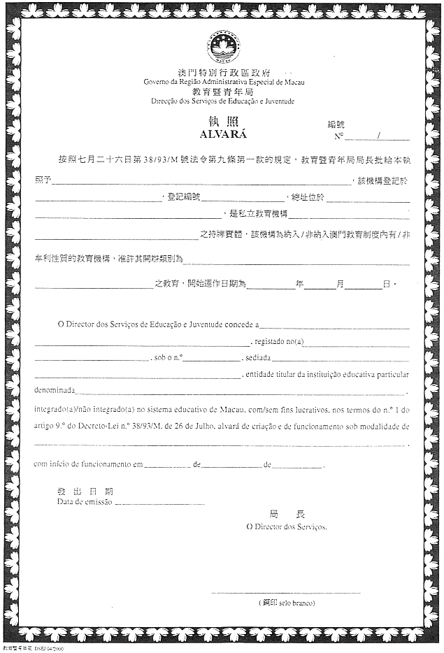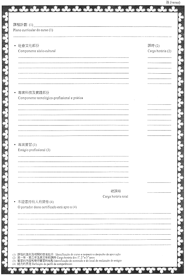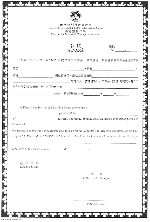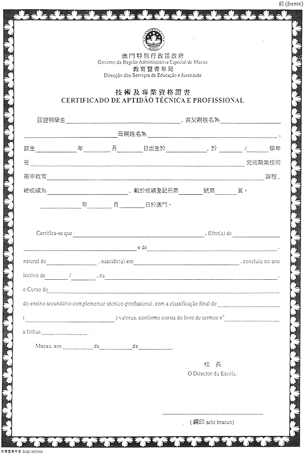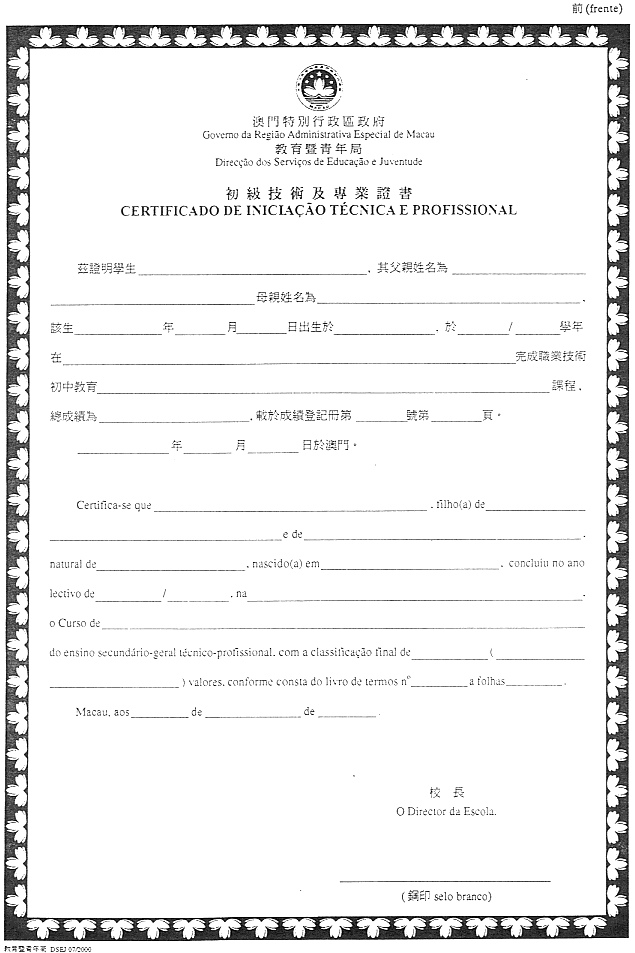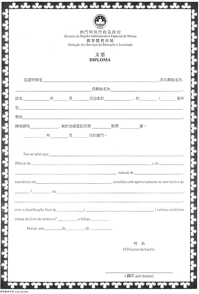 一、核准載於本批示附件內並作為本批示組成部份的文憑和證書式樣,該文憑和證書由印務局專責印製,並在教育暨青年局屬下教育機構取得小學、初中及高中,包括九月十六日第54/96/M號法令訂定之職業技術教育模式的學歷證明時使用。