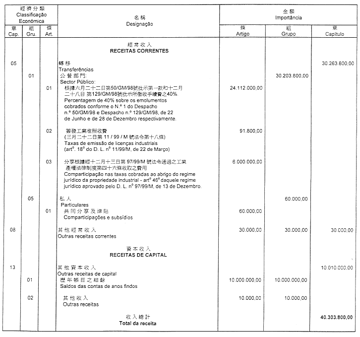 | 經濟分類 | 名稱 | 金額 (澳門幣) |