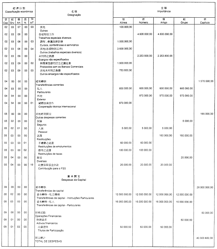 二、二零零零年之負擔由登錄於本年度澳門特別行政區總預算第四十章「投資計劃」內經濟分類07.10.00.00.02、次項目8.051.018.21之撥款支付。