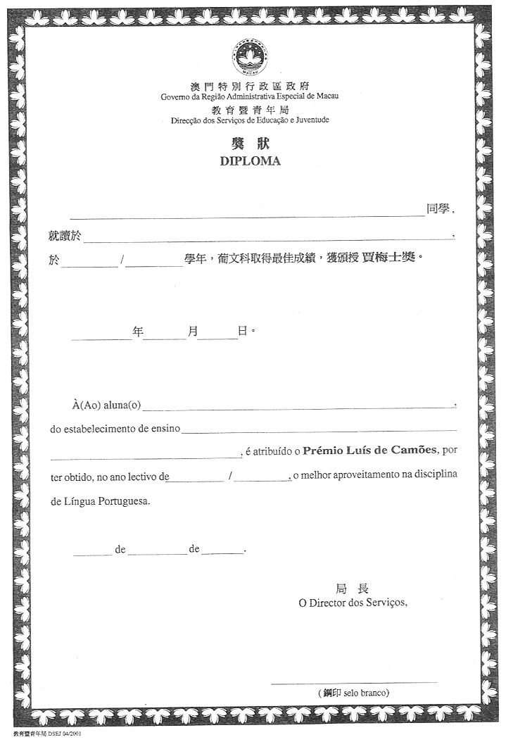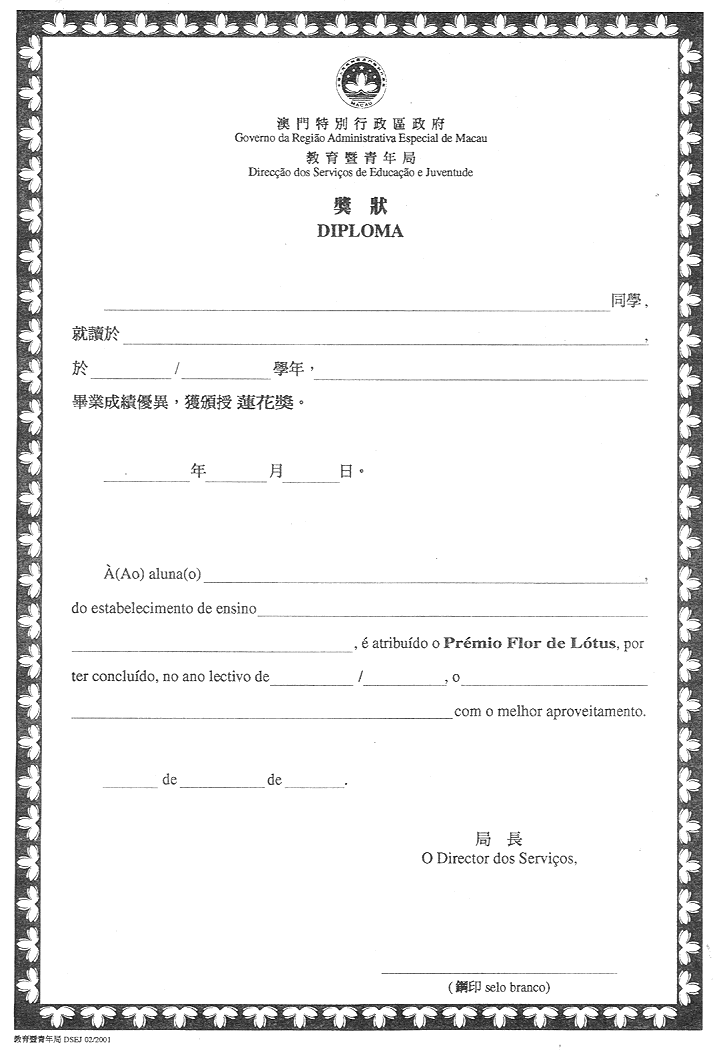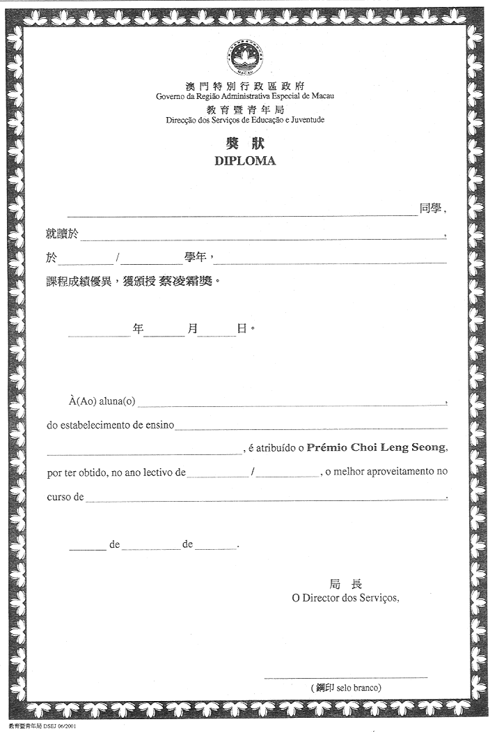 一、核准載於本批示附件內並作為本批示組成部份的獎狀式樣;用作授予學習成績優異之獎狀由印務局專責印製。